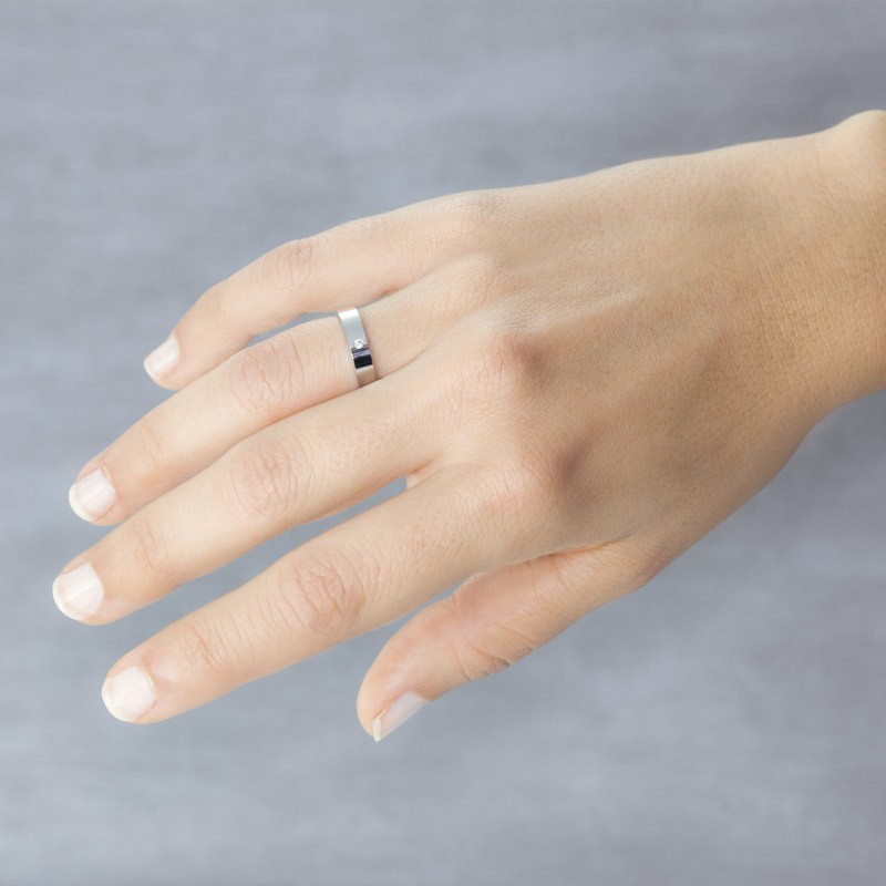 Alianza con diamante, hecha con oro blanco de 18 kilates (750 mmas) aro liso y plano con acabado en brillo y en el que se ha engastado un diamante talla brillante de 0,02 quilates de peso, color H y pureza SI, este modelo con piedra es específico para mujer, el mismo para hombre por lo general es sin piedra, es un modelo perfecto para casarse con él, sencillo y fácil de combinar, también disponible en oro de 9 kilates con el mismo aspecto y el mismo resultado pero muy barato, vale aproximadamente la mitad que el de 18 ktes.