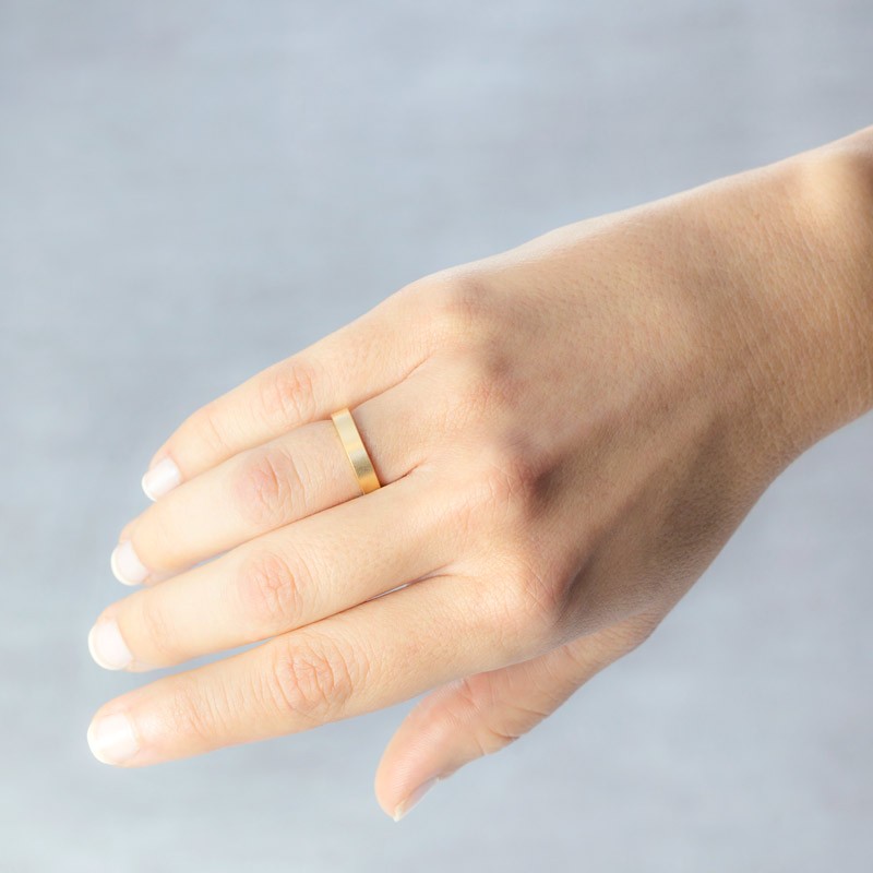 Alianza de boda oro amarillo 1ª ley 18 ktes. terminación plana de 4 mm. de ancho y un grueso aproximado de 1,30 mm. el acabado es matizado efecto arena. Las alianzas planas son unas clásicas por las que no pasa el tiempo, en la actualidad como el modelo que aquí nos ocupa si hay más posibilidades de acabados diferentes, pero tened en cuenta que todos los matizados con el paso del tiempo se tornan brillo y si queremos llevarla como cuando la estrenamos necesita un mantenimiento regular dependiendo del uso que las demos.