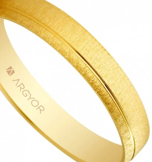 La Alianza de boda oro se destaca por su diseño innovador y sofisticado. Con una anchura peculiar de 3,50 mm, este anillo se diferencia de los modelos más convencionales, que suelen ser de 3 o 4 mm. La combinación de un acabado mate y un gallón brillante que divide la chapa en dos partes asimétricas le otorga una apariencia moderna y elegante. Este diseño no solo es estéticamente agradable, sino que también simboliza la unión de dos partes distintas en una sola.