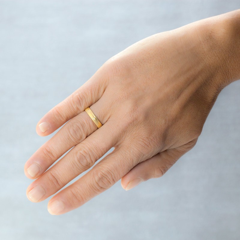 El acabado texturizado de esta alianza, junto con un fino granulado, resalta la belleza del oro amarillo. La combinación de texturas y el rebaje brillo crean una superficie que capta la luz de manera impresionante, haciendo que esta joya sea un verdadero deleite visual.