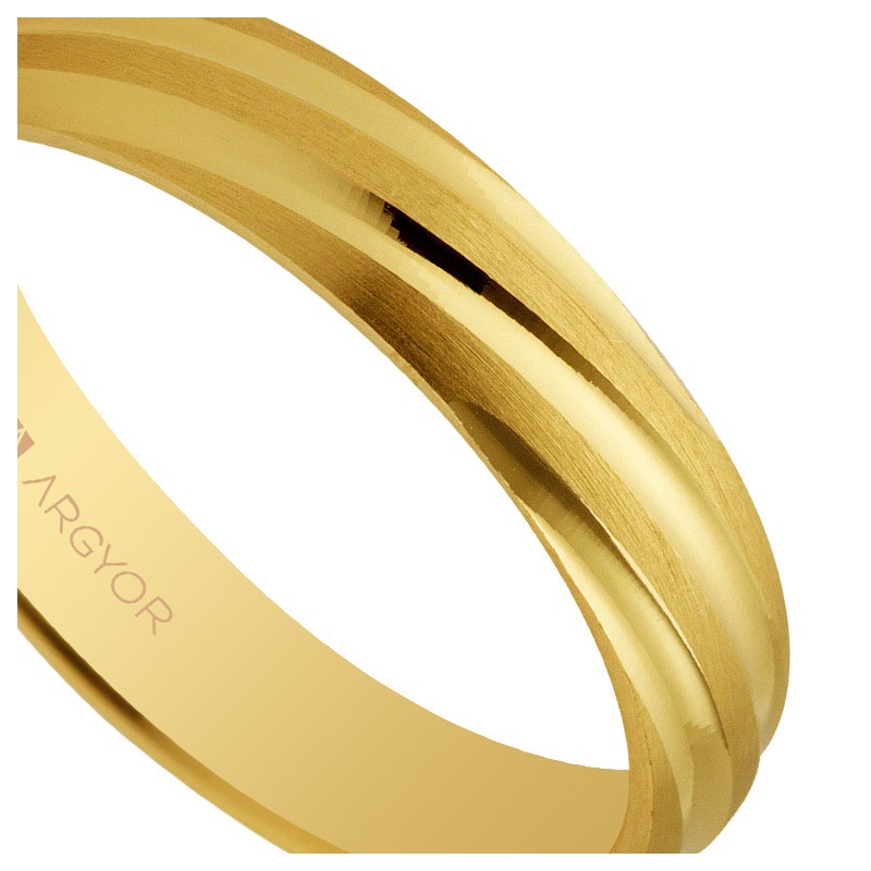 El diseño de la Alianza de oro amarillo es único gracias a sus acabados combinados. La superficie del anillo alterna entre zonas mate satinadas y áreas de brillo, creando un contraste visual elegante y moderno. Los surcos diagonales añaden un toque de dinamismo al diseño, haciendo que cada alianza sea única y especial. Esta combinación de texturas no solo mejora la apariencia del anillo, sino que también resalta su sofisticación y estilo.