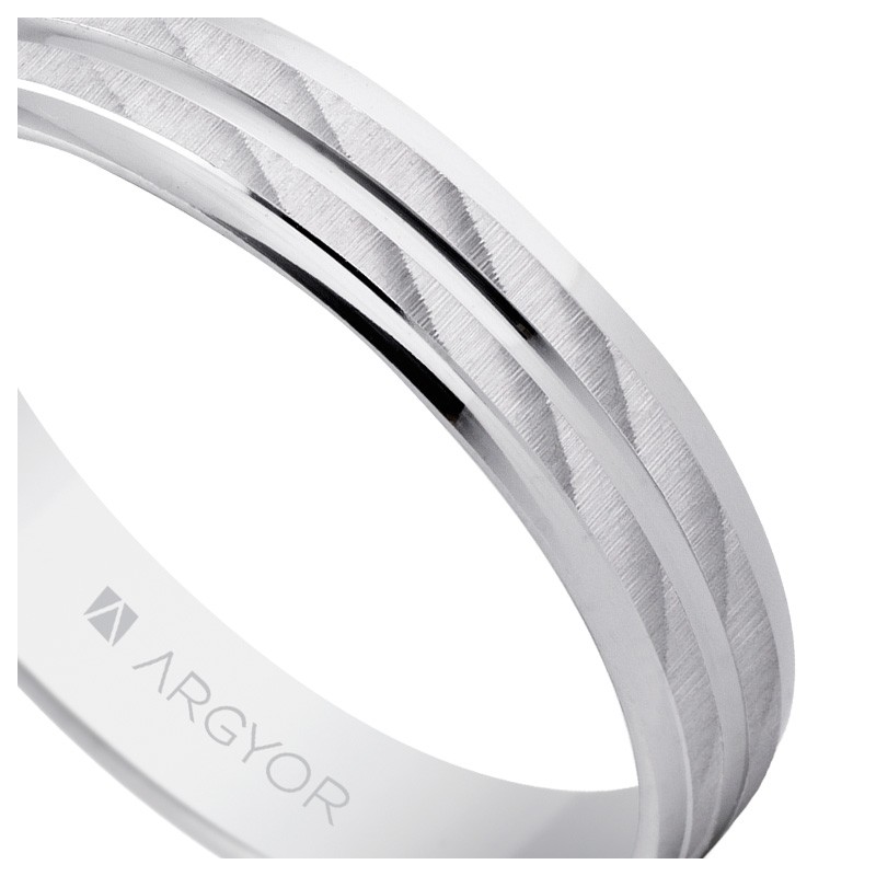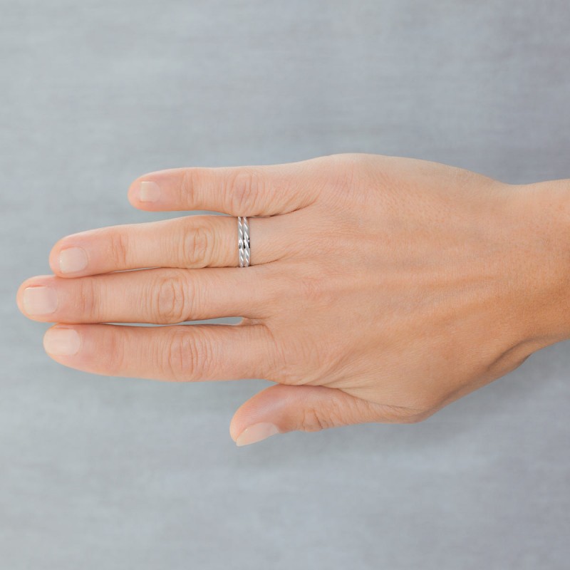 Alianza de plata con baño de rodio, de acabado mate y brillo, de 4 milímetros de anchura. El diseño es plano con 2 bandas rectas paralelas estriadas diagonalmente y su interior es plano, con un grosor menor de 1 mm, un anillo aparentemente simple de gran atractivo para recordar siempre.