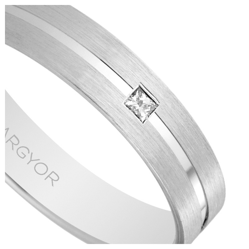 El diseño de esta alianza oro blanco se distingue por su acabado mate dividido en dos partes iguales por una hendidura o gallón de acabado brillante. Esta característica no solo añade un toque de estilo contemporáneo, sino que también proporciona un contraste visual que realza la belleza del anillo. La hendidura brillante es una particularidad que convierte esta alianza en una joya única y especial.