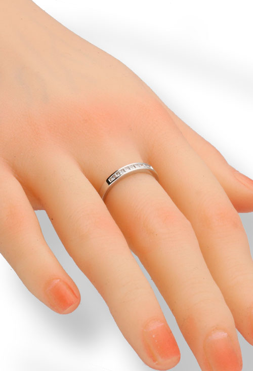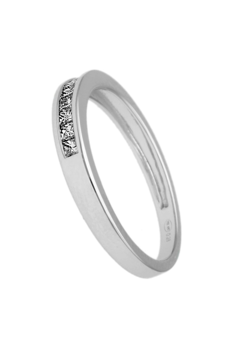 Las sencillas formas de este anillo desvelan un diseño deliberadamente estructurado para maximizar la luz que cada diamante refleja. A semejanza de un delicado mosaico, los diamantes talla princesa se ensamblan creando un corredor de reflejos y destellos, capturando la esencia de un momento inolvidable.