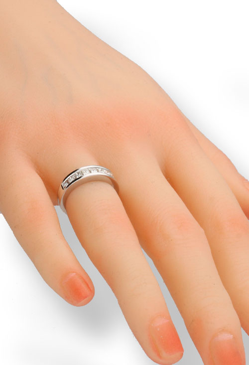 El diseño tipo carril confiere una superficie límpida y lisa, donde los 9 diamantes talla princesa se alinean en perfecta armonía. Este despliegue de gemas crea un efecto de infinito brillo, respondiendo con destellos vivaces ante cualquier fuente de luz. Por su forma pulida, libre de garras o aristas, ofrece comodidad y versatilidad, haciendo que este anillo de compromiso sea ideal para llevar en cualquier ocasión.