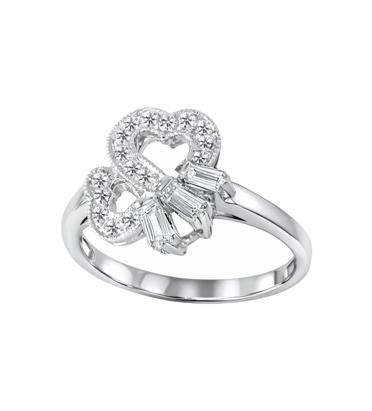 Colgante de oro que redefine el romanticismo en su máxima expresión. Este exclusivo anillo de compromiso en oro blanco 18k con diamantes talla brillante y baguette forma delicados corazones entrelazados que simbolizan amor eterno. Una pieza sofisticada que une tradición y diseño contemporáneo para un momento inolvidable. Disponible inmediatamente en talla 12. Descubre la excelencia y exclusividad de una joya creada para brillar toda la vida.