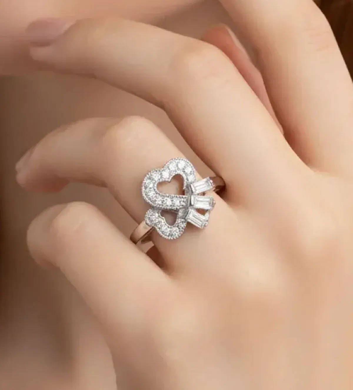 El diseño destaca por su galería de corazones entrelazados de 12×12 milímetros, una composición que aporta volumen, presencia y un impacto visual extraordinario. Las formas curvas de los corazones se complementan con la estructura geométrica de las baguettes, creando un equilibrio perfecto entre romanticismo clásico y modernidad.