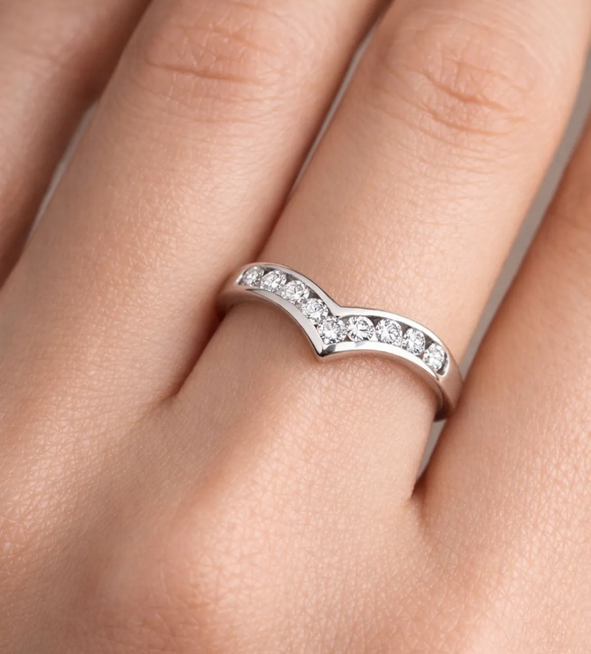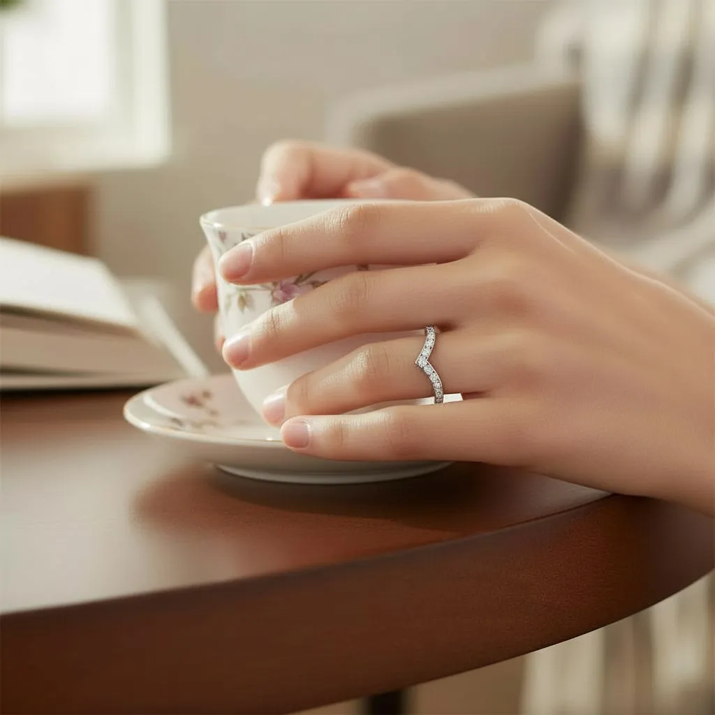 El diseño en pico simboliza la unión de dos caminos que se encuentran, representando compromiso, crecimiento y estabilidad. Los diamantes, por su parte, son el símbolo universal de la eternidad, la pureza y la fortaleza del amor verdadero.