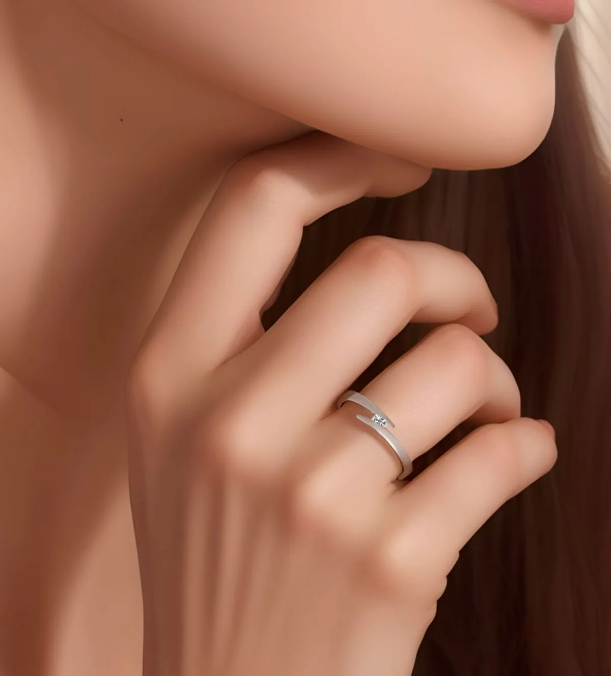El diseño del anillo destaca por su brazo cruzado, símbolo de la intersección de dos caminos que se convierten en uno. Este detalle artístico, junto con el engaste minucioso del diamante, crea una composición que expresa tanto unión como belleza. Su perfil elegante y estilizado hace que sea cómodo para el uso diario, sin sacrificar sofisticación ni presencia.