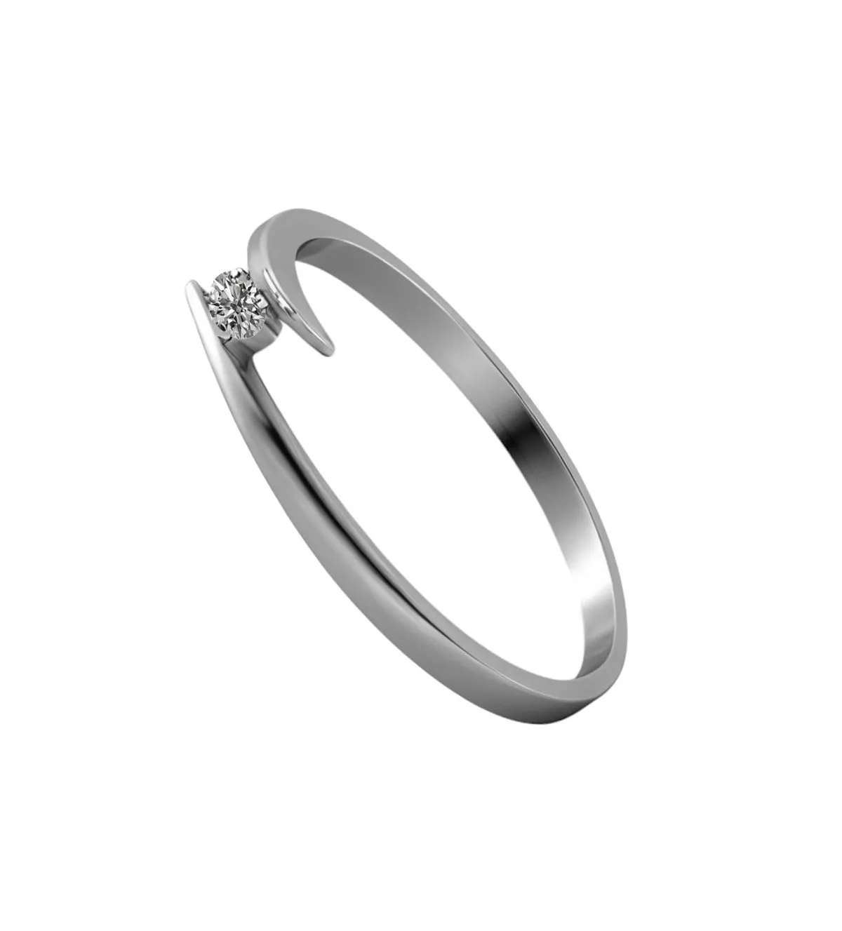 Anillo de compromiso en oro blanco con diamante brillante, símbolo eterno de amor. Su diseño cruzado evoca la unión perfecta y el diamante central brilla con intensidad única. Disponible para entrega inmediata en talla 14 y ajustable a otras medidas. Una joya exclusiva de Rubí Joyeros que refleja tu promesa más importante. ¡Hazla tuya hoy antes de que se agote!