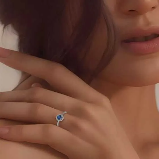 Confeccionado en oro blanco de 18 quilates, este anillo garantiza durabilidad y un brillo excepcional que se mantiene con el tiempo. El protagonista es un zafiro azul de extraordinaria calidad, rodeado por un halo de diamantes talla brillante, piedras seleccionadas cuidadosamente para maximizar su resplandor.