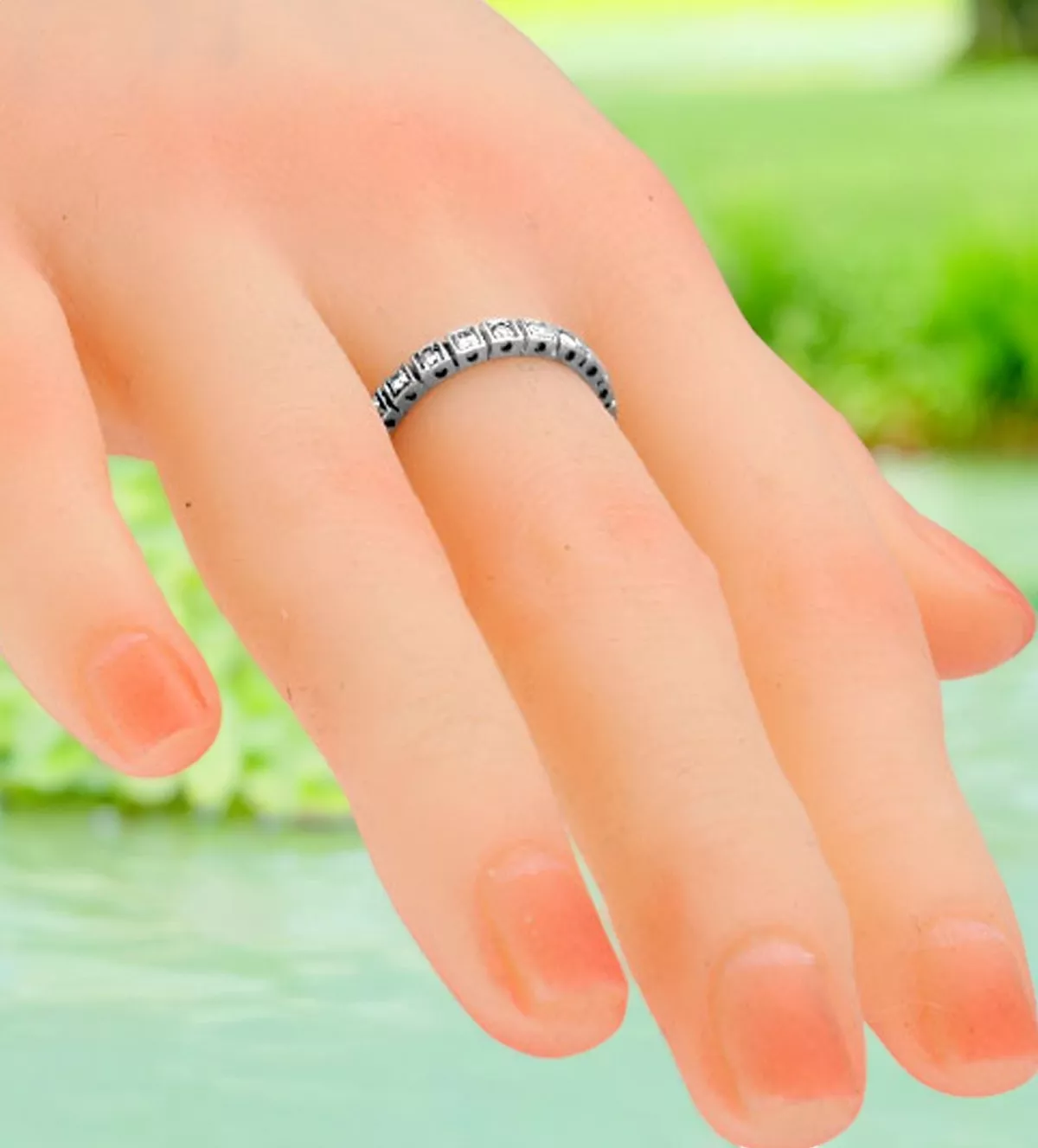 El diseño del anillo de compromiso “Eternidad” es, sin duda, una de las características que lo hacen destacar. La disposición de los 22 brillantes en boquillas cuadradas crea un patrón continuo y simétrico que rodea todo el anillo, simbolizando el ciclo eterno del amor. Las ventanas circulares en cada engaste multiplican los destellos de claridad, permitiendo que la luz fluya a través de los diamantes desde todos los ángulos.