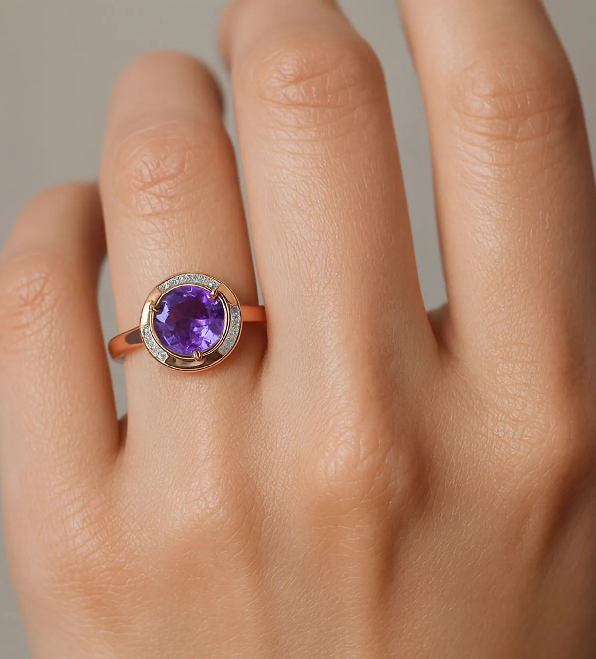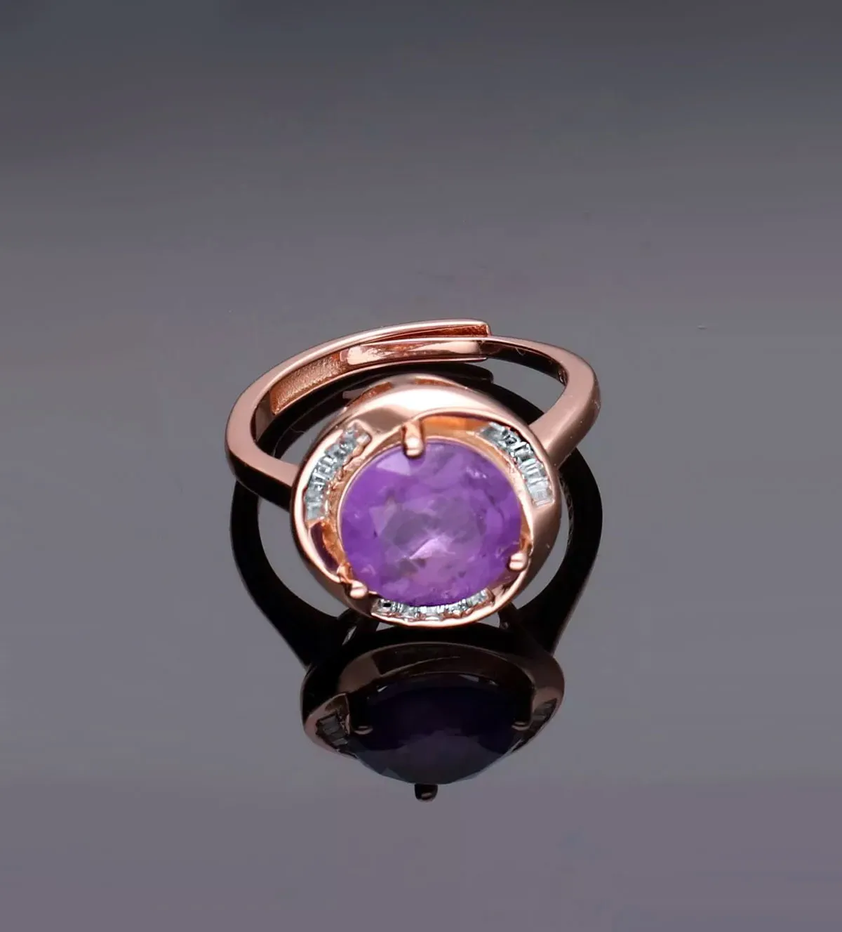 El diseño de este anillo de plata combina armoniosamente la intensidad de la amatista con la suavidad del oro rosa. La gema central se encuentra enmarcada por un bisel de circonitas cuidadosamente engastadas, creando un contraste visual que realza su color y su profundidad.