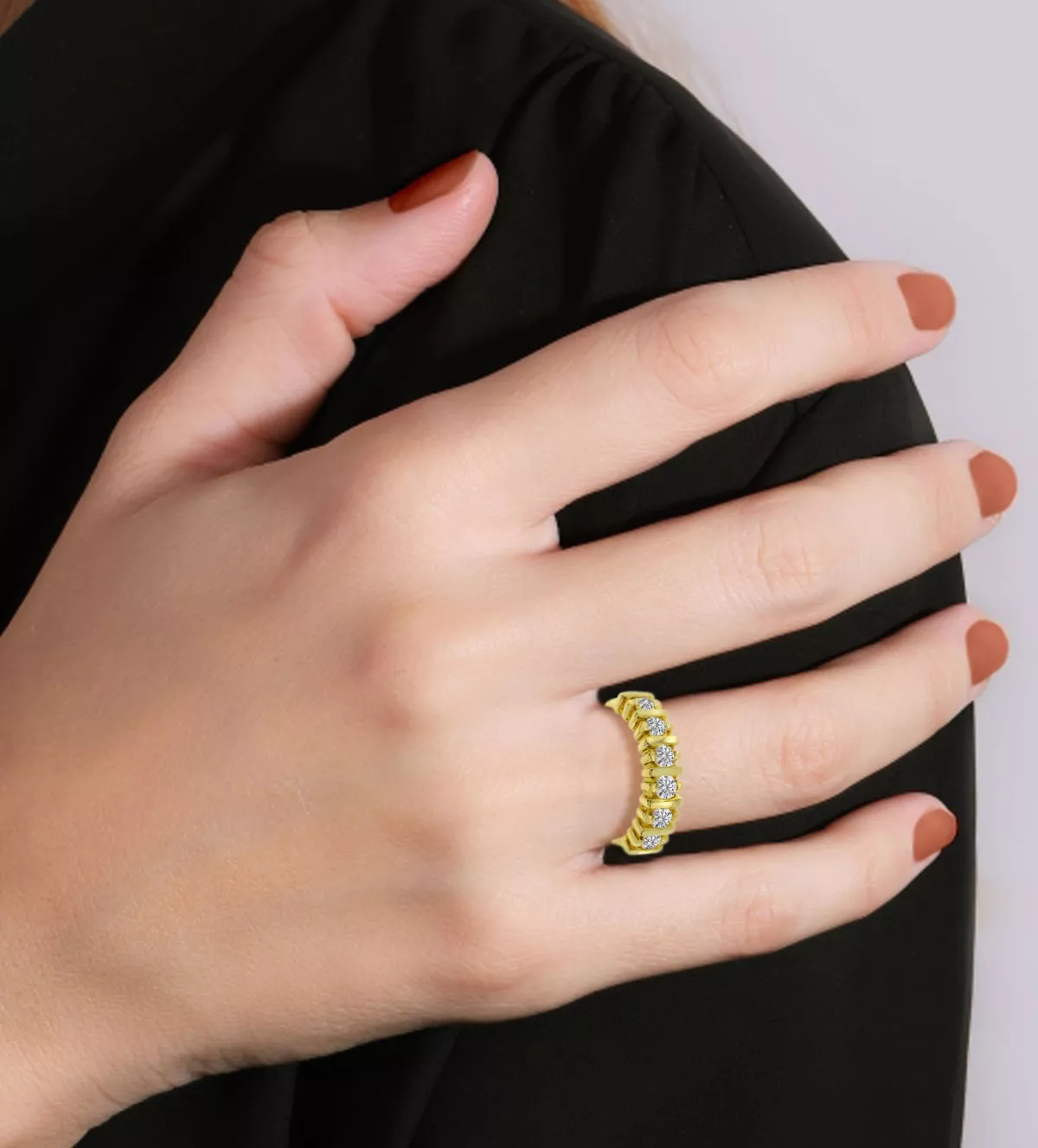 El anillo es una media alianza compuesta por seis deslumbrantes diamantes talla brillante, alcanzando un total de 0,84 quilates. Estos diamantes destacan por su color H y pureza VS, asegurando así su belleza atemporal y brillo deslumbrante. Cada piedra preciosa está cuidadosamente engastada en garras de diseño continuo para garantizar la máxima seguridad y resaltar su esplendor natural.