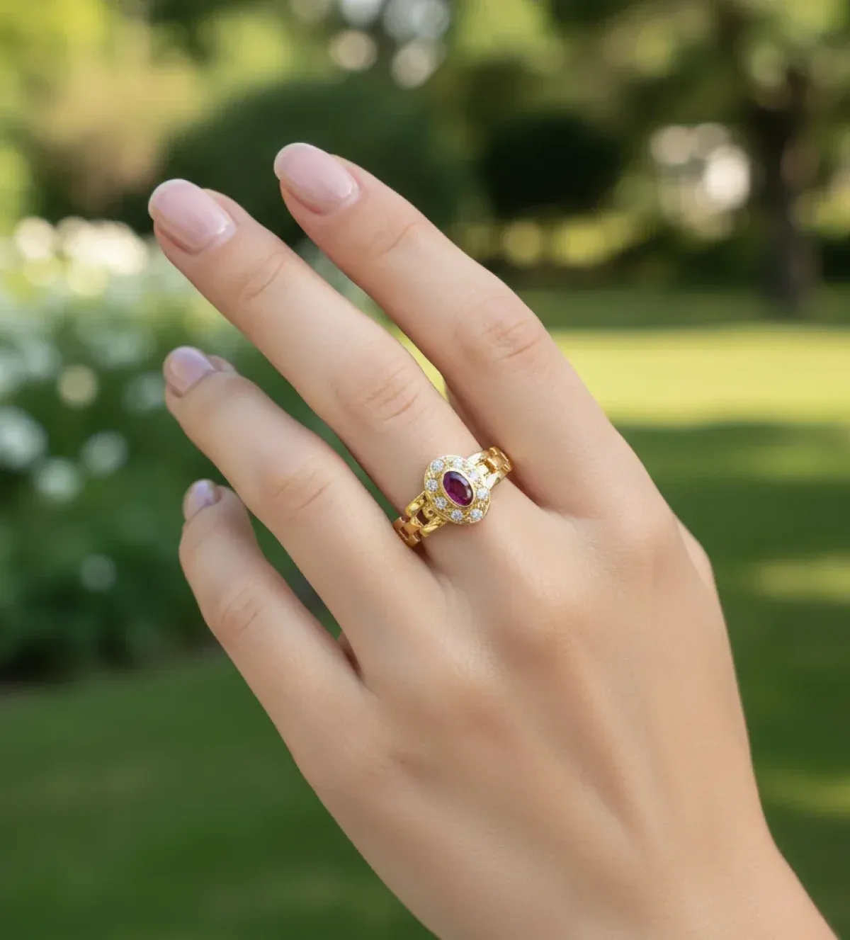 Rodeando el rubí encontramos una delicada orla de circones cuidadosamente engastados, que multiplican la luminosidad de la pieza y crean un efecto visual deslumbrante. El conjunto ofrece un equilibrio perfecto entre color, brillo y elegancia.