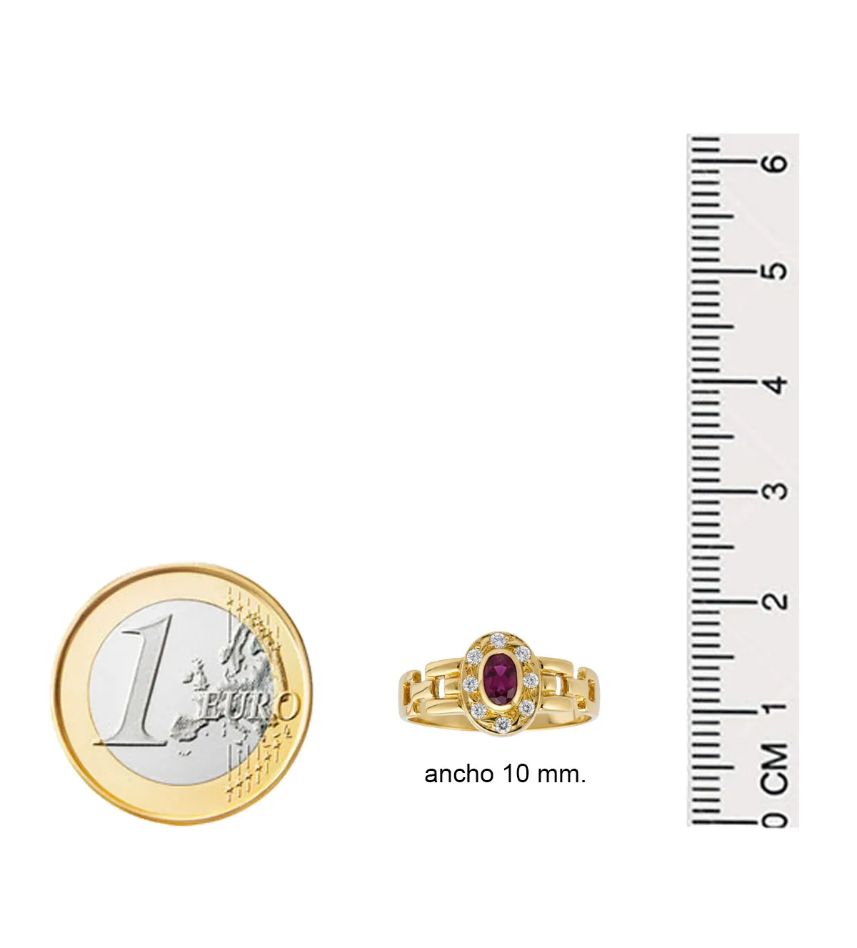 En el centro destaca un rubí oval de 3×5 mm, piedra preciosa asociada tradicionalmente a la pasión, la energía y la fuerza interior. Su tonalidad roja intensa aporta carácter y sofisticación.