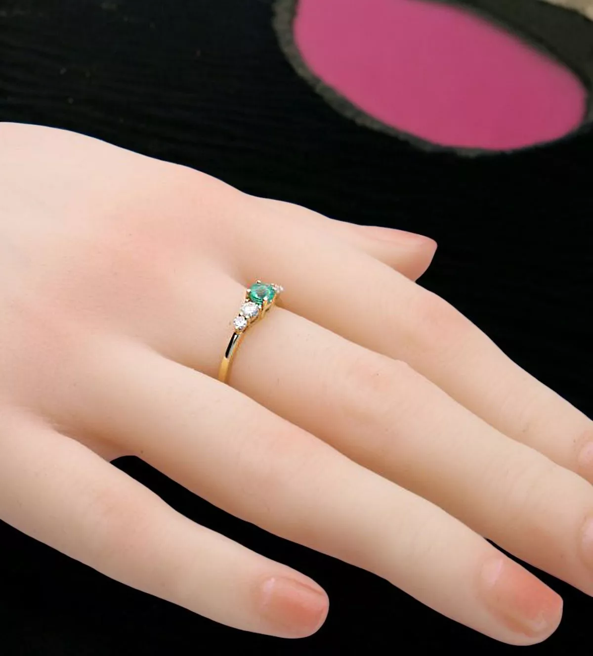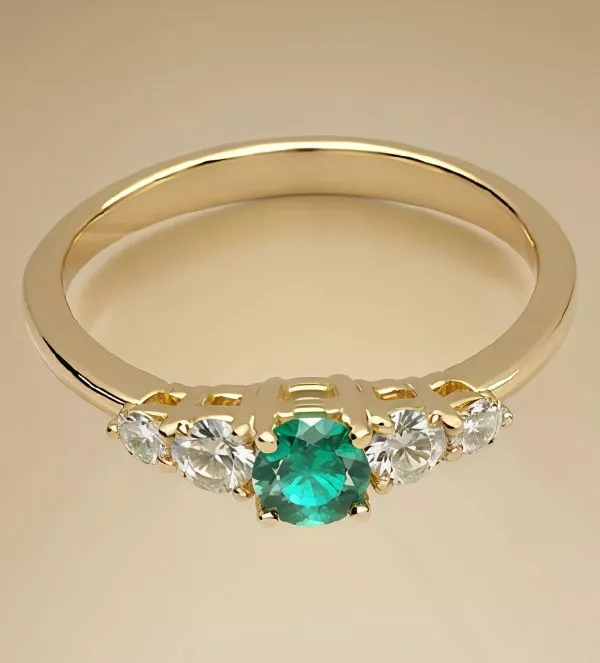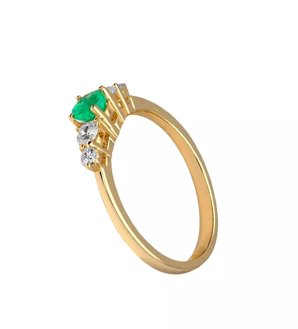 Este anillo de oro está elaborado con oro amarillo de 18 quilates (750 milésimas), lo que asegura su calidad y durabilidad. La pureza del oro utilizado garantiza que cada pieza mantenga su brillo y belleza a lo largo del tiempo. Los brillantes, cuidadosamente engastados en garras consecutivas, añaden un toque de destello y glamour, mientras que la esmeralda de talla redonda, situada en el centro, aporta un color vibrante y fresco. Este delicado equilibrio entre materiales de alta gama hace que el anillo “Vergel” sea una opción irresistible para quienes valoran la calidad en sus joyas.
