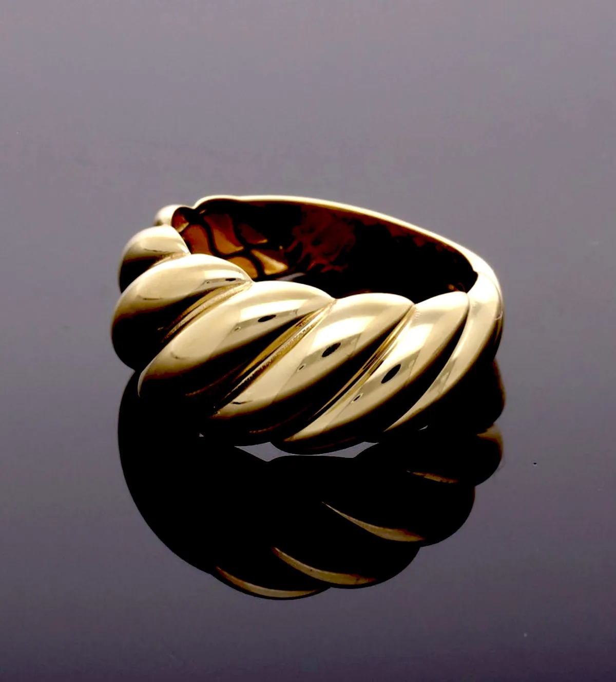 El diseño de gallones diagonales en relieve, con una forma ligeramente convexa, aporta dinamismo y volumen a la pieza, logrando un equilibrio perfecto entre tradición y modernidad. Su acabado de brillo pulido intensifica la luz, haciendo que cada movimiento potencie aún más la belleza del anillo.