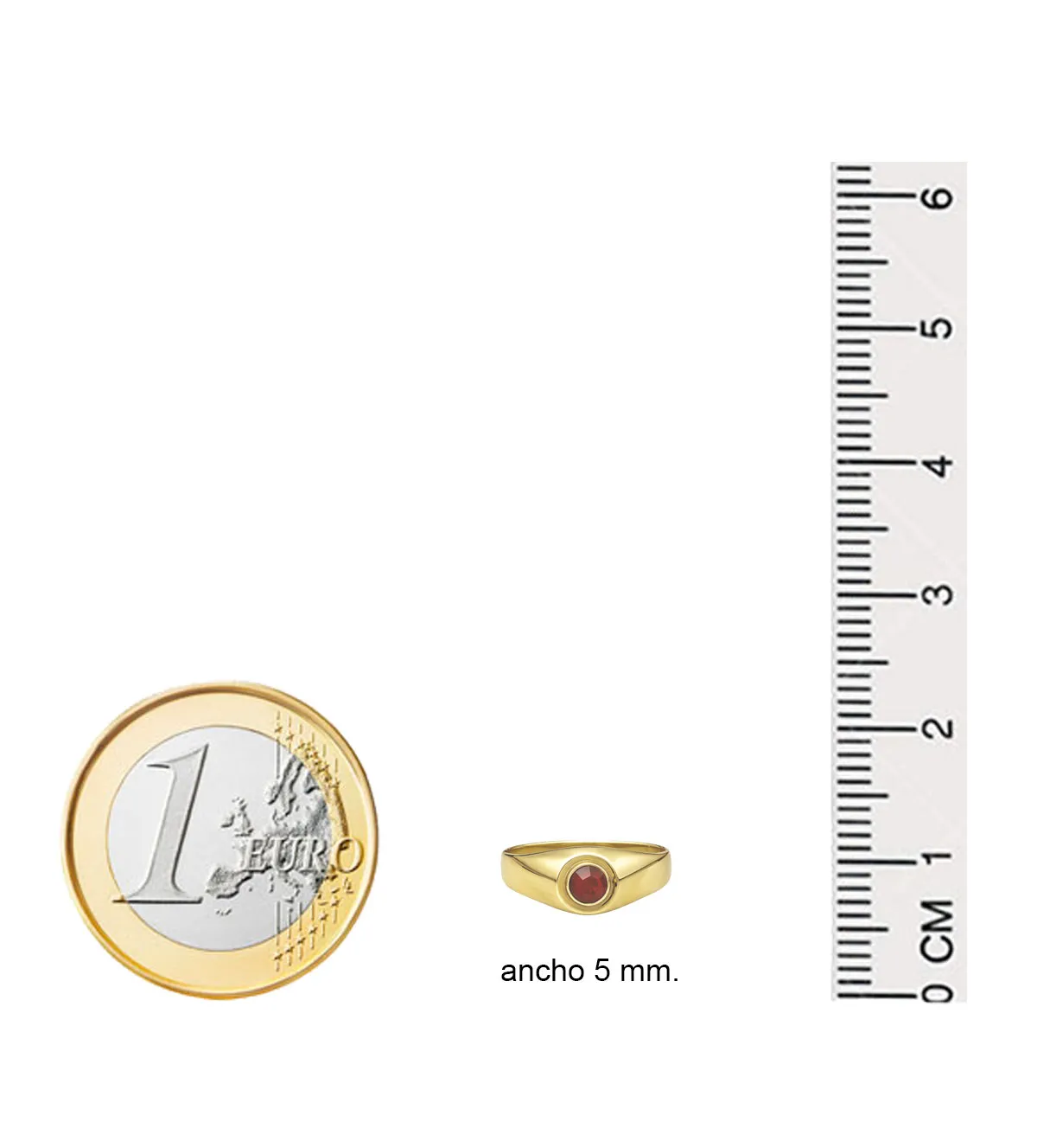 El anillo está fabricado en oro amarillo de 18 quilates, un metal precioso reconocido por su pureza, durabilidad y valor atemporal. El acabado pulido brillo realza la calidez natural del oro, ofreciendo una superficie suave y luminosa que refleja la luz con elegancia. Como detalle central, incorpora un pequeño simil de rubí engastado en boquilla, aportando un toque de color sofisticado y seguro, ideal para una joya infantil. Cada anillo de oro ha sido elaborado siguiendo estrictos controles de calidad joyera.