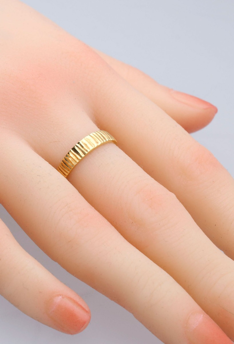 Anillo de oro para mujer, brazo en disminución con adornos longitudinales a modo de gallones efecto mate y brillo, sortija muy fácil de llevar y de combinar con otras joyas.