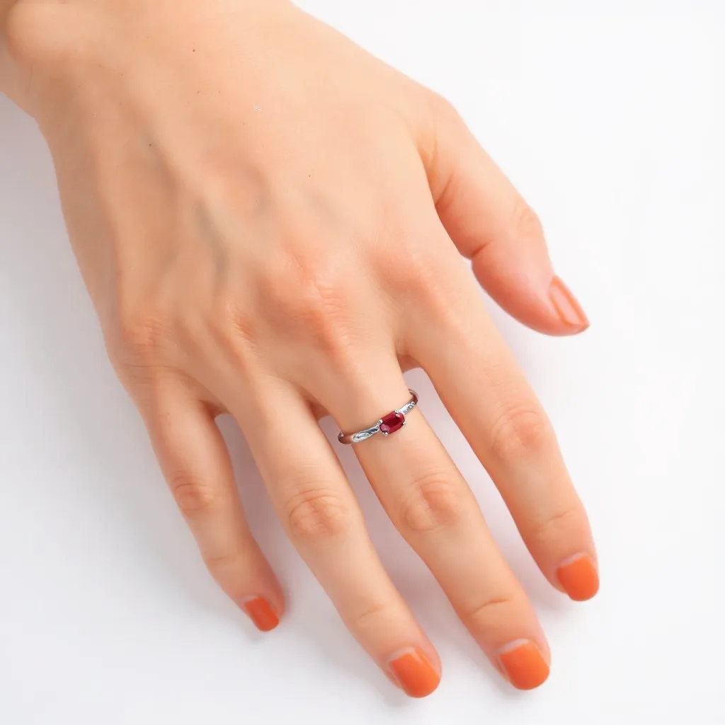 El brazo plano con circonitas finamente engastadas añade un toque de luminosidad extra, logrando un equilibrio visual que se adapta tanto a ocasiones formales como al uso diario. La elección del oro blanco como base aporta modernidad y realza el contraste con el rubí.
