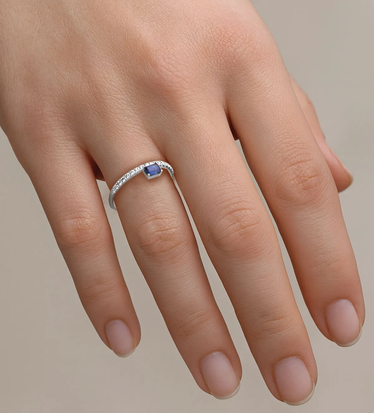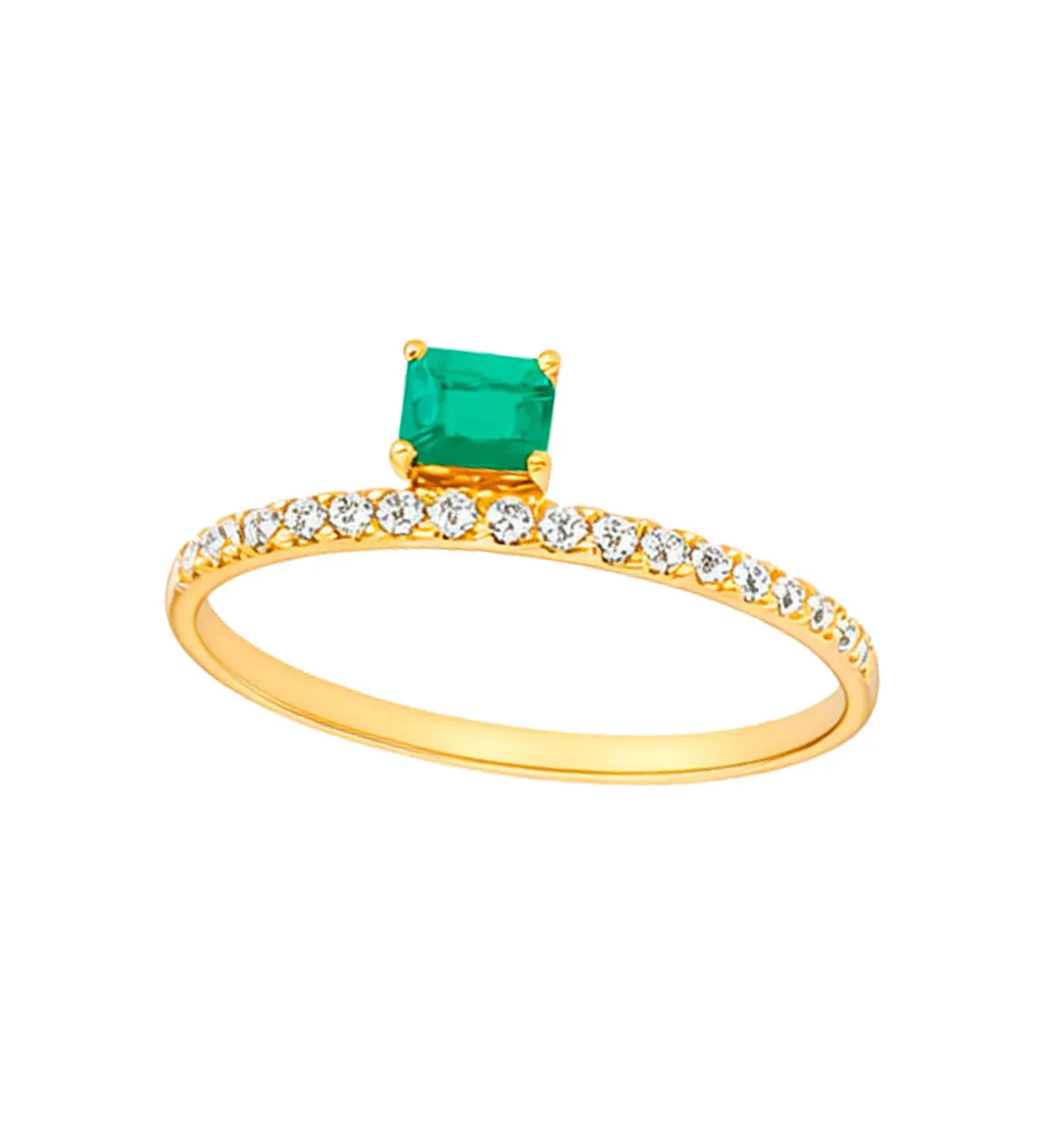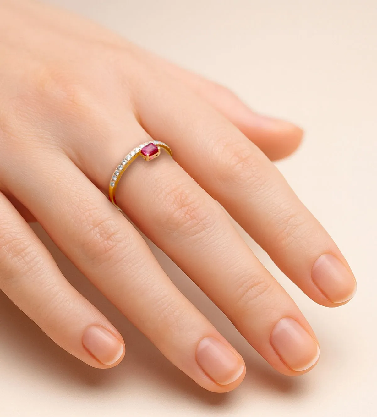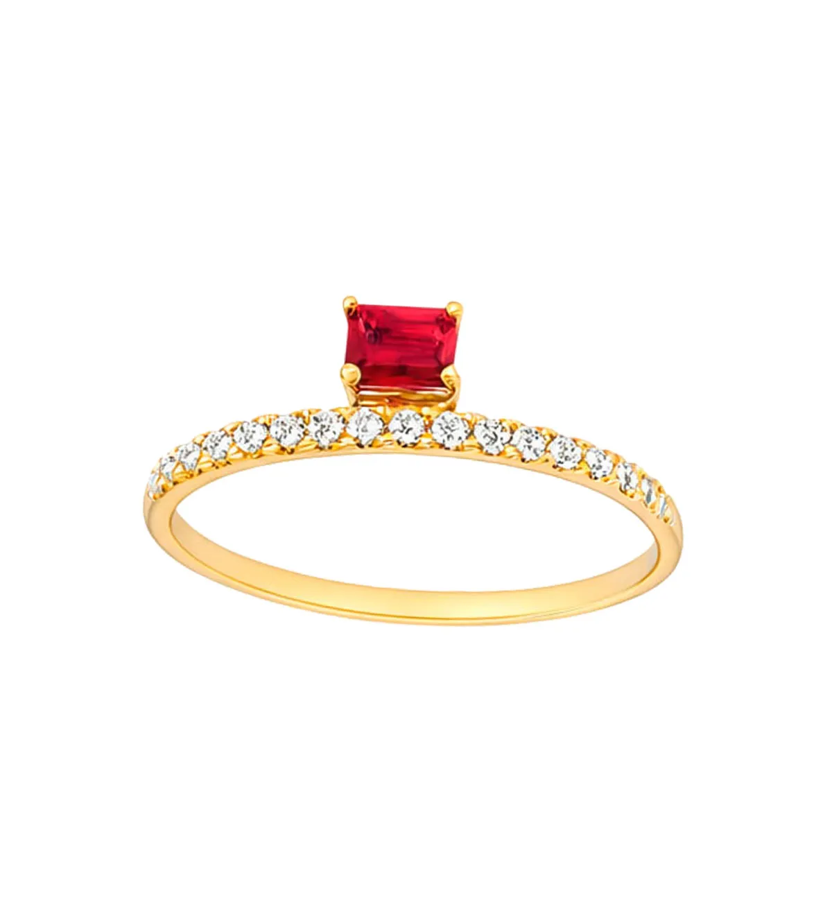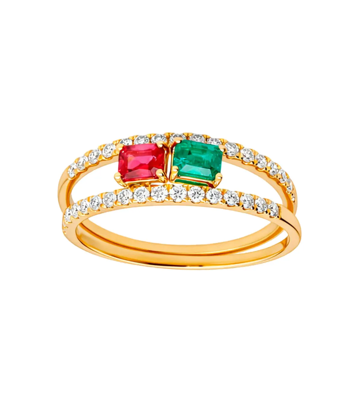 La pieza se realza con brillantes cuidadosamente seleccionados que aportan luminosidad y distinción, acompañados por una piedra preciosa de talla rectangular. Puedes elegir entre zafiro, rubí o esmeralda, todas gemas reconocidas por su belleza, simbolismo y valor, lo que convierte cada anillo en una joya con identidad propia.