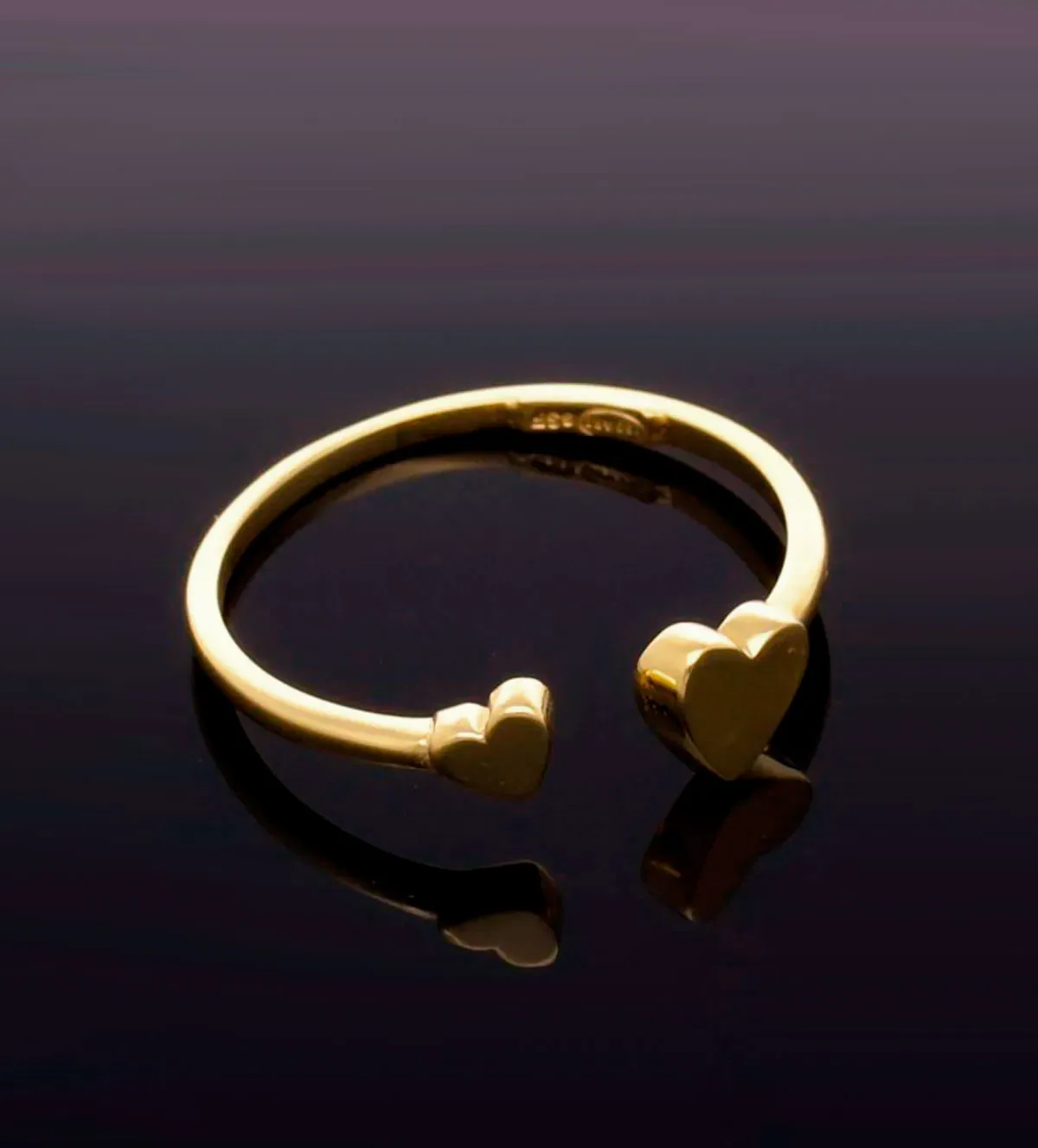 Lo que hace especial a este anillo de oro es su diseño abierto, moderno y cargado de significado. En sus extremos encontramos dos corazones finamente pulidos, uno de ellos de 5 mm, que destacan por su delicadeza y su capacidad para captar la luz.