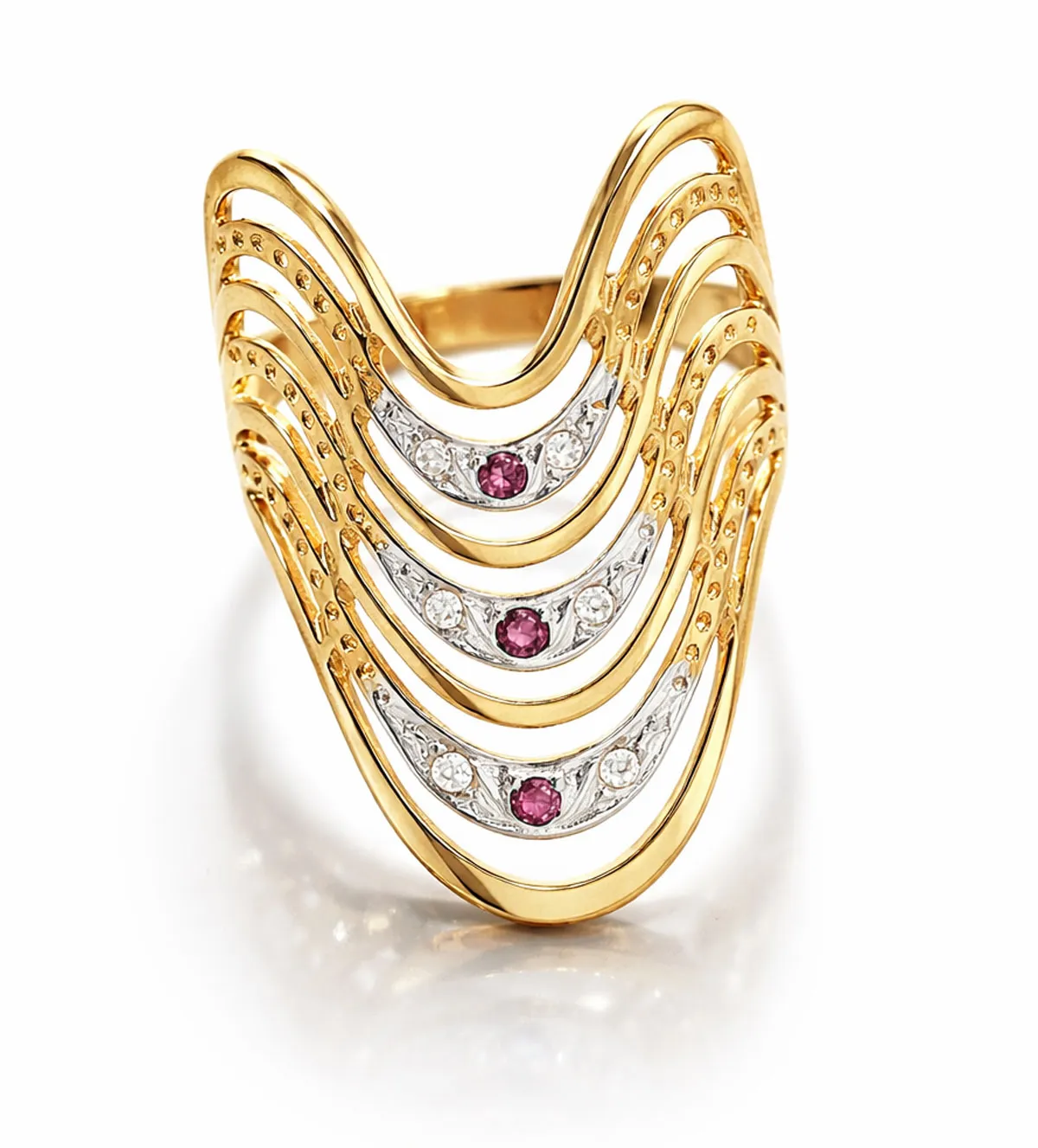 Su diseño distintivo se caracteriza por un brazo plano que disminuye gradualmente y varias ondas verticales en oro amarillo y blanco, engastadas con rubíes y circonitas. Este patrón crea un efecto visual dinámico que recuerda al arte y la simbología egipcia, aportando personalidad y elegancia a cada movimiento de la mano. La combinación de metales y piedras preciosas convierte este anillo en un accesorio versátil y llamativo, perfecto para quienes buscan piezas de joyería con historia y estilo propio.
