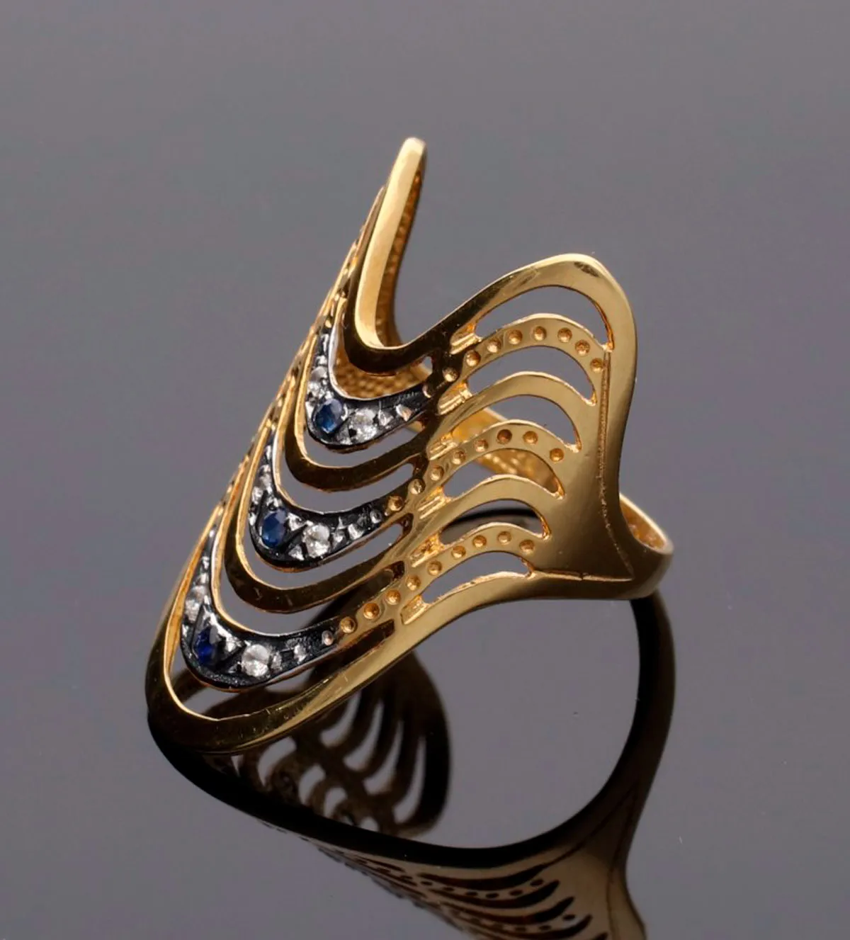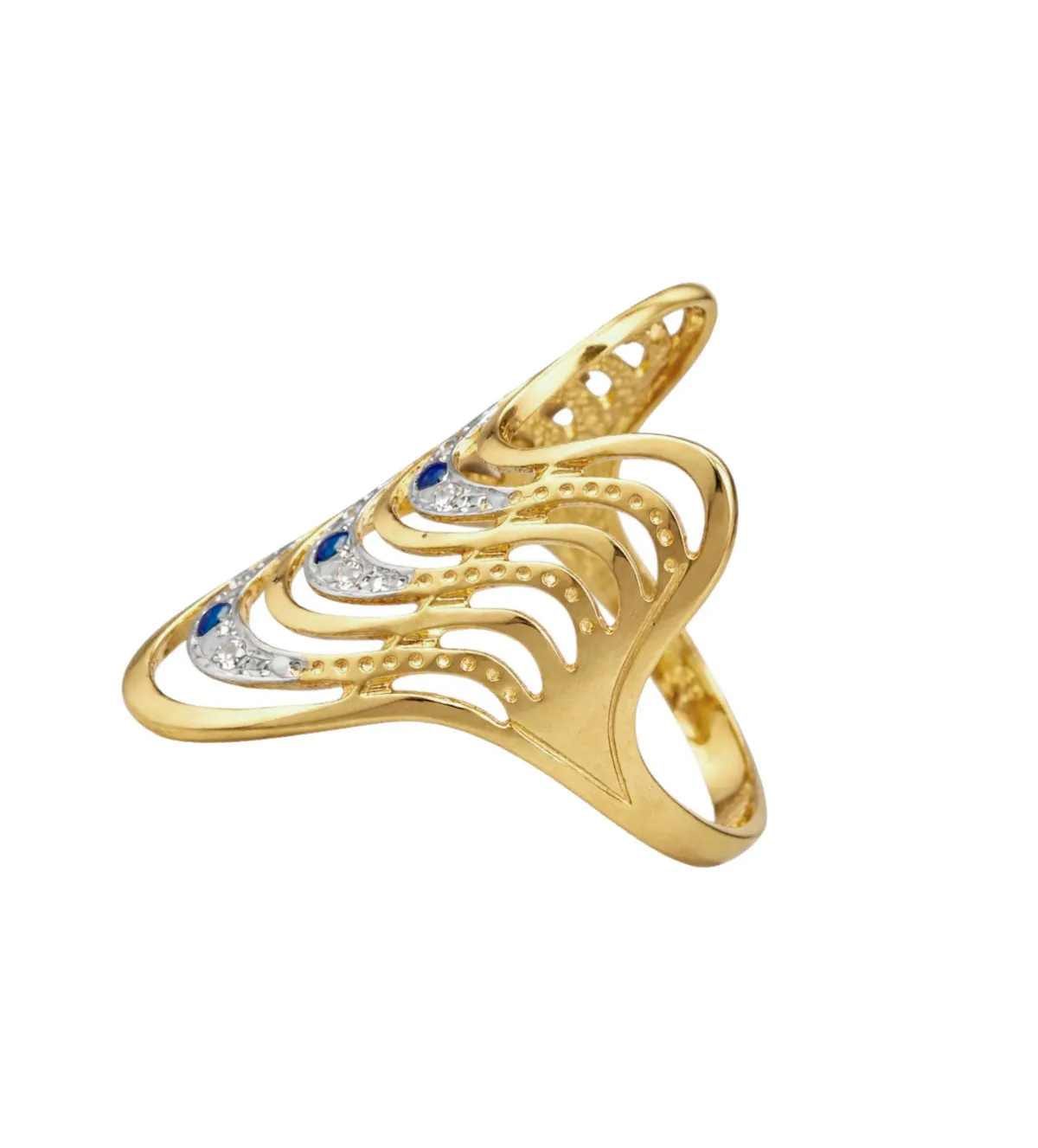 El diseño de este anillo de oro se reconoce como modelo egipcio por su clara inspiración en las joyas del Antiguo Egipto. Desde un brazo plano en disminución emergen lanzaderas verticales en forma de ondas que alternan oro amarillo y oro blanco.
