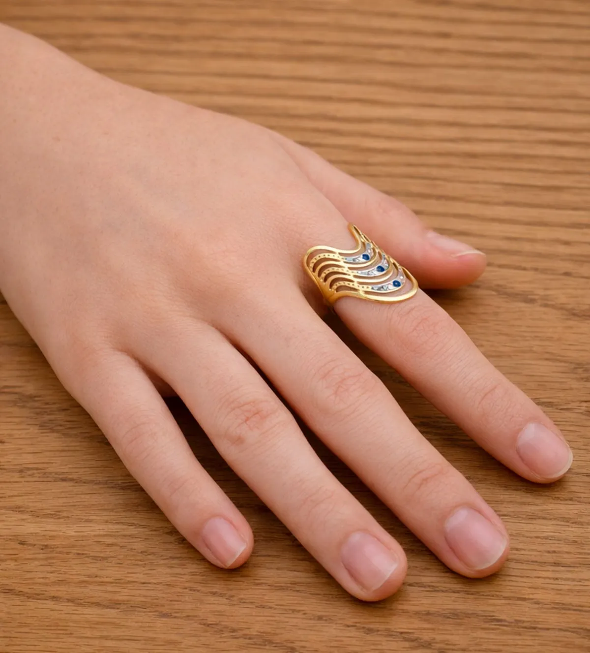 Estas ondas crean un efecto dinámico y elegante que estiliza el dedo y genera volumen sin excesos. La disposición de las piedras sobre las curvas metálicas aporta un juego de luces sofisticado que se aprecia desde cualquier ángulo.