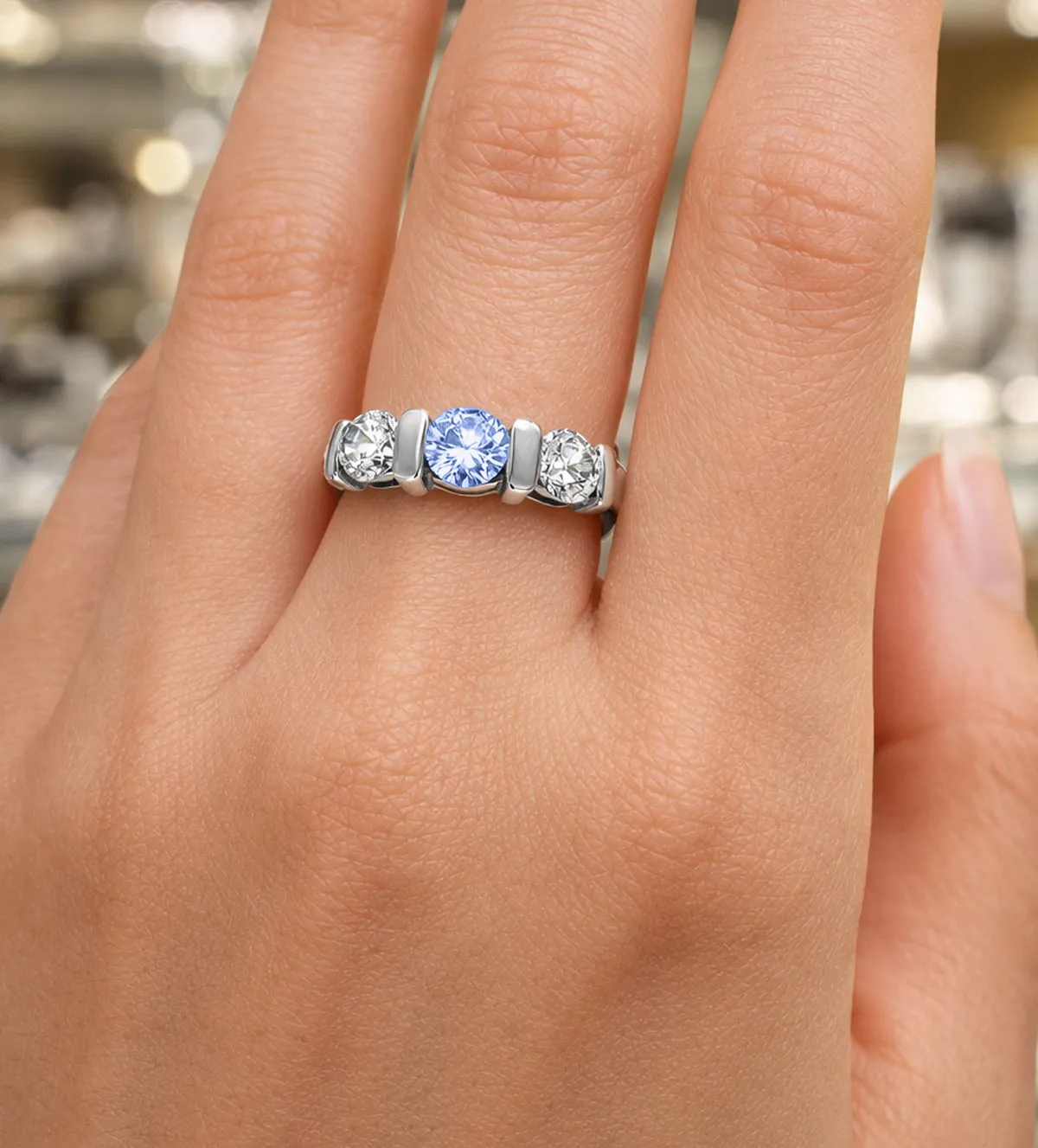 Su estética tresillo, protagonizada por una piedra central de color azul intenso acompañada de dos brillantes circonitas, crea un equilibrio visual que aporta sofisticación y personalidad a la joya. El contraste entre el brillo del oro blanco y el color del topacio convierte esta sortija en una pieza que capta miradas y realza cualquier estilo.