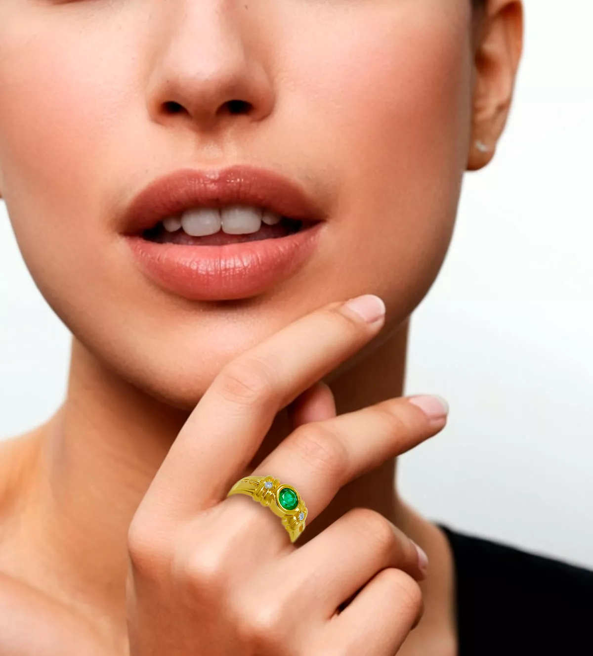 El diseño del anillo de oro “Green” combina líneas clásicas y modernas, destacando la esmeralda engastada en una boquilla sobria y sofisticada, que permite que la piedra luzca al máximo. Los dos diamantes que acompañan a la gema principal se integran con suavidad en el diseño, equilibrando el conjunto y ofreciendo un aspecto armónico. Esta joya está creada para destacar en cualquier ocasión, brindando elegancia sin excesos.