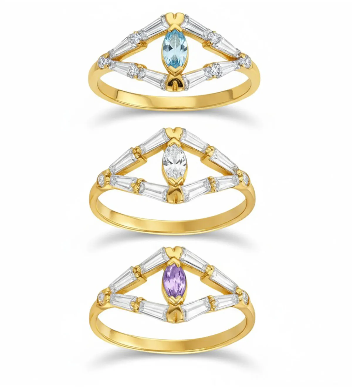 Piedras: Circonitas talla baguette y piedra central en circón rosa o topacio azul.