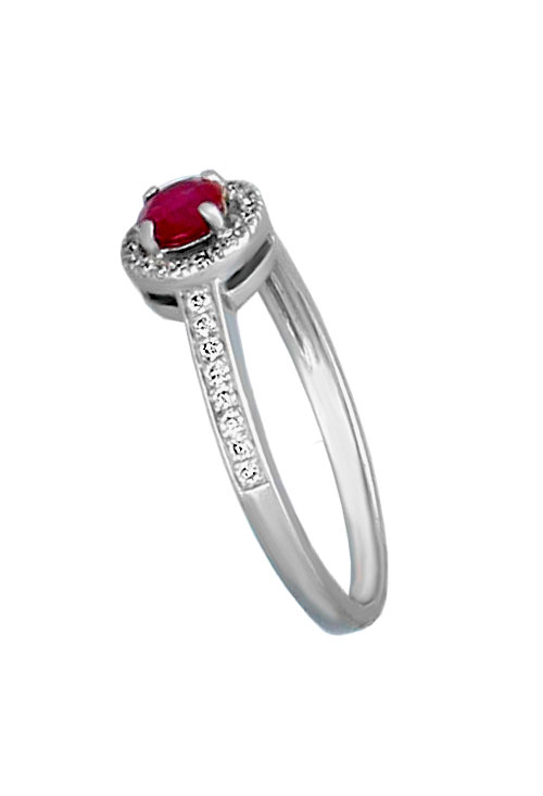 Anillo de oro blanco en el que la piedra central es un rubí con talla redonda engastado en garra de 4 patas y rodeado por una orla de diamantes que también discurren en hilera por las hombreras del aro