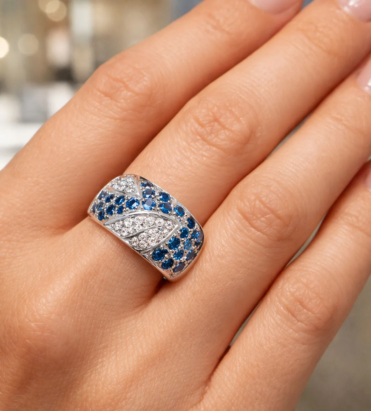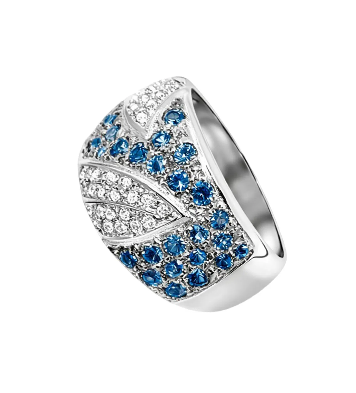 La superficie del anillo está completamente cuajada de circonitas blancas y azul aguamarina que forman un delicado motivo floral. Este diseño crea una composición armoniosa que transmite feminidad, sofisticación y estilo.