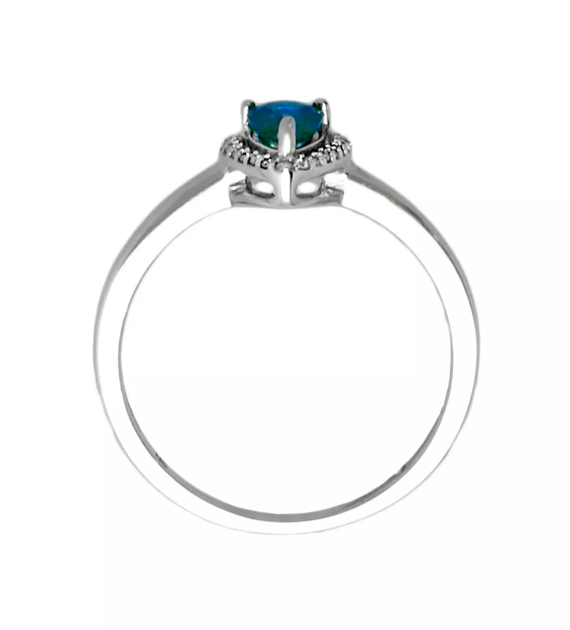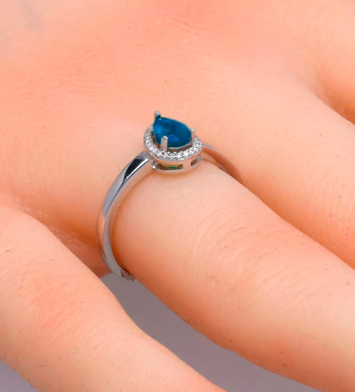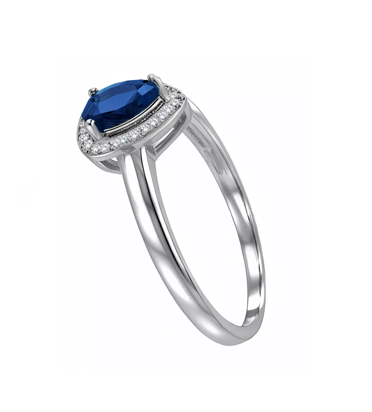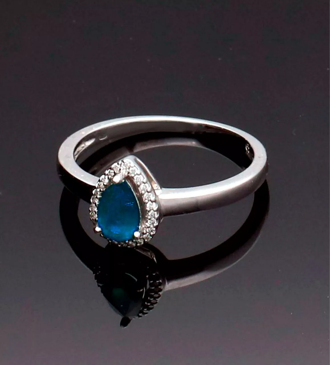 Anillo de oro blanco 18k con zafiro talla pera y diamantes.