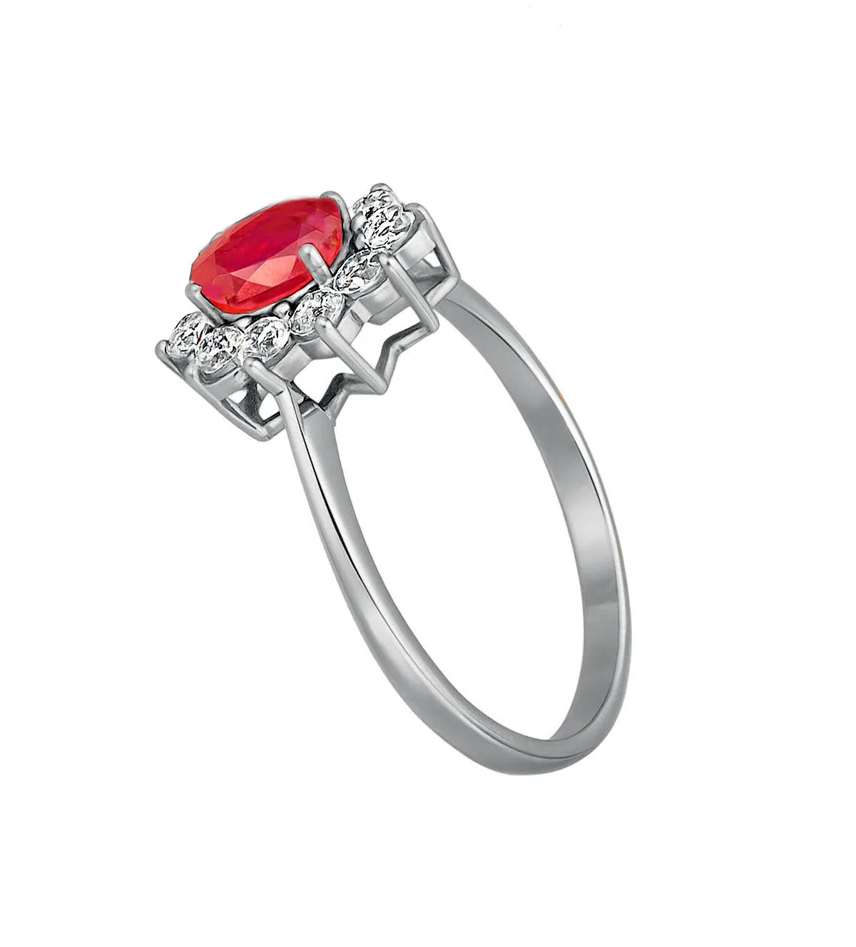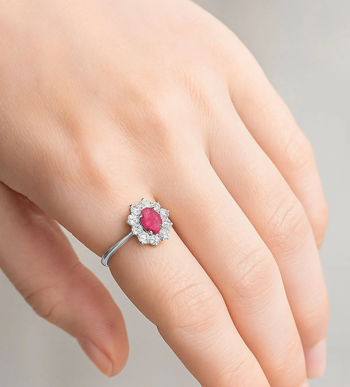 Este modelo destaca por un rubí de talla ovalada de 7×5 mm, rodeado por una orla de 10 circonitas engastadas en garras individuales. Cada detalle ha sido cuidadosamente trabajado para resaltar la belleza de la piedra central, creando un contraste brillante entre el rojo intenso del rubí y el resplandor de las circonitas.