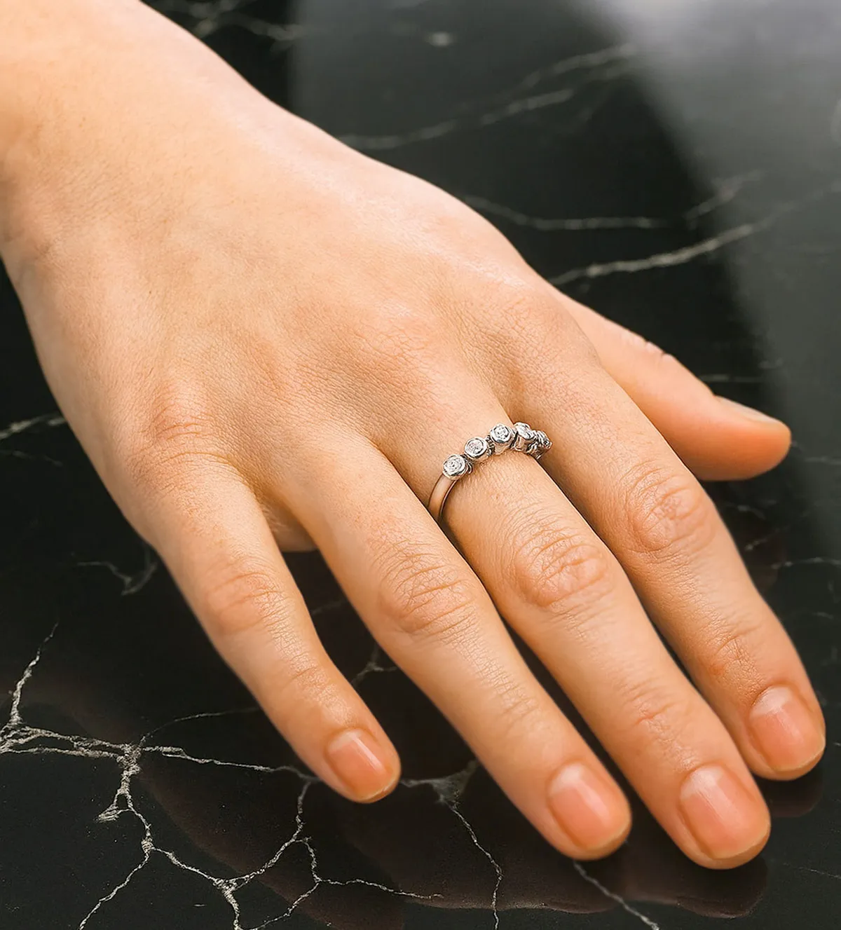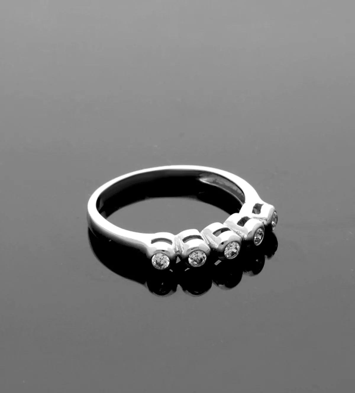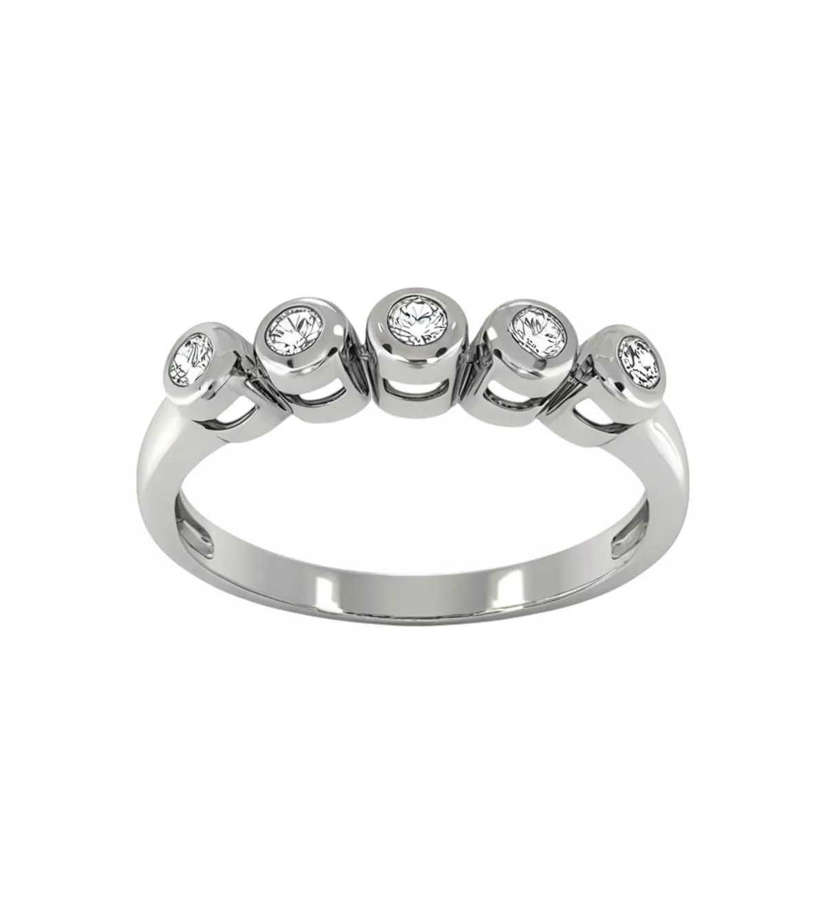 El anillo cuenta con un diseño minimalista y refinado. Sus 5 circonitas blancas, engastadas en chatón, maximizan la luminosidad y resaltan sobre la estructura de oro blanco, proporcionando un efecto de mayor volumen y brillo.