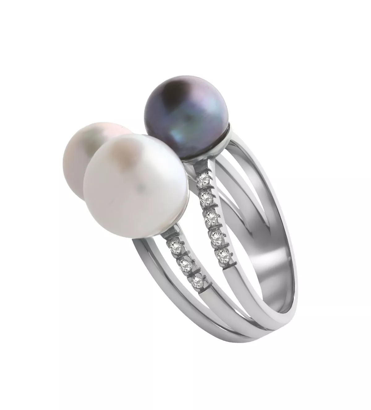Este anillo está elaborado con oro blanco de ley de 18 kilates, garantizando resistencia y durabilidad. Las tres perlas cultivadas, en tonos blanco, gris y rosa, son seleccionadas cuidadosamente para lograr una armonía perfecta en color y tamaño. Los diamantes, con un peso total de 0,12 quilates, destacan por su corte brillante y claridad, maximizando su destello al captar la luz desde cualquier ángulo.