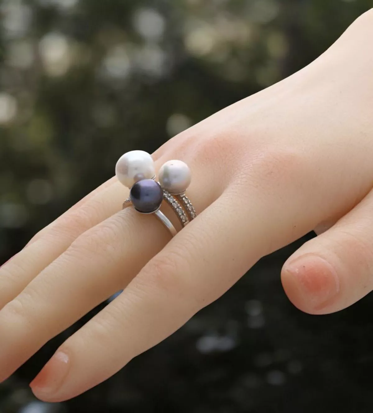 Con un peso aproximado de 10,10 gramos, este anillo ofrece comodidad sin sacrificar su imponente presencia. Las perlas principales miden 10 mm (blanca) y 8 mm (de color), lo que garantiza un equilibrio perfecto entre elegancia y funcionalidad. Su estructura se ajusta cómodamente al dedo, adaptándose a su uso diario o para ocasiones especiales.