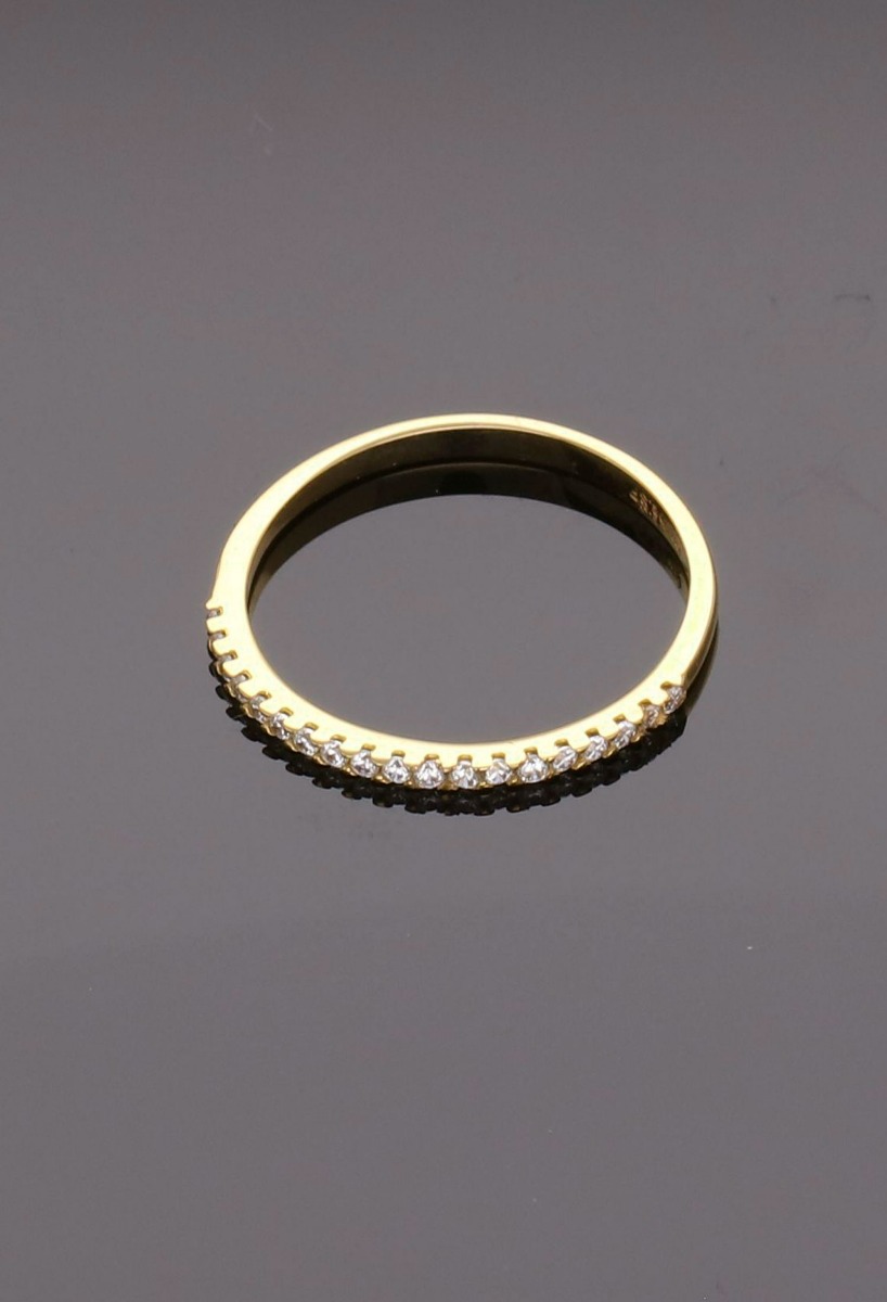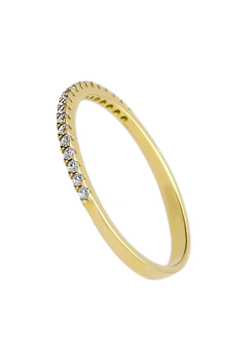 Anillo oro ley, medía alianza circonitas, este elegante anillo de oro amarillo de 18k con circonitas es la elección perfecta para cualquier mujer que busque un toque de lujo en su estilo. Con una media alianza de circonitas engastadas en garra, este anillo brilla con calidad y sofisticación. Con 1,5 milímetros de ancho, esta pieza es ideal para ser usada como ajustador y evitar que los anillos más grandes se salgan del dedo. Realizado en oro amarillo de primera ley 750 milésimas, este anillo es sin duda una adición refinada a cualquier colección de joyas.