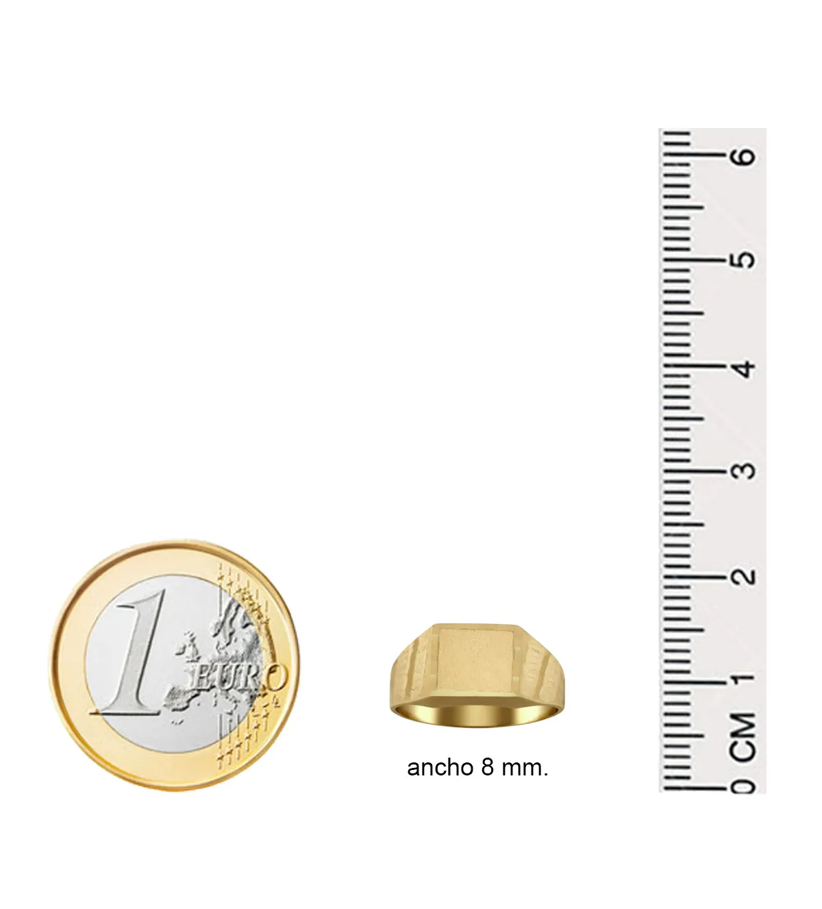 El sello presenta un ancho frontal de 8 mm, lo que le otorga una presencia visible pero equilibrada para manos pequeñas. El peso aproximado de 1,60 gramos varía según la talla, lo que permite ajustarlo cómodamente a diferentes edades sin comprometer la estética ni la comodidad.