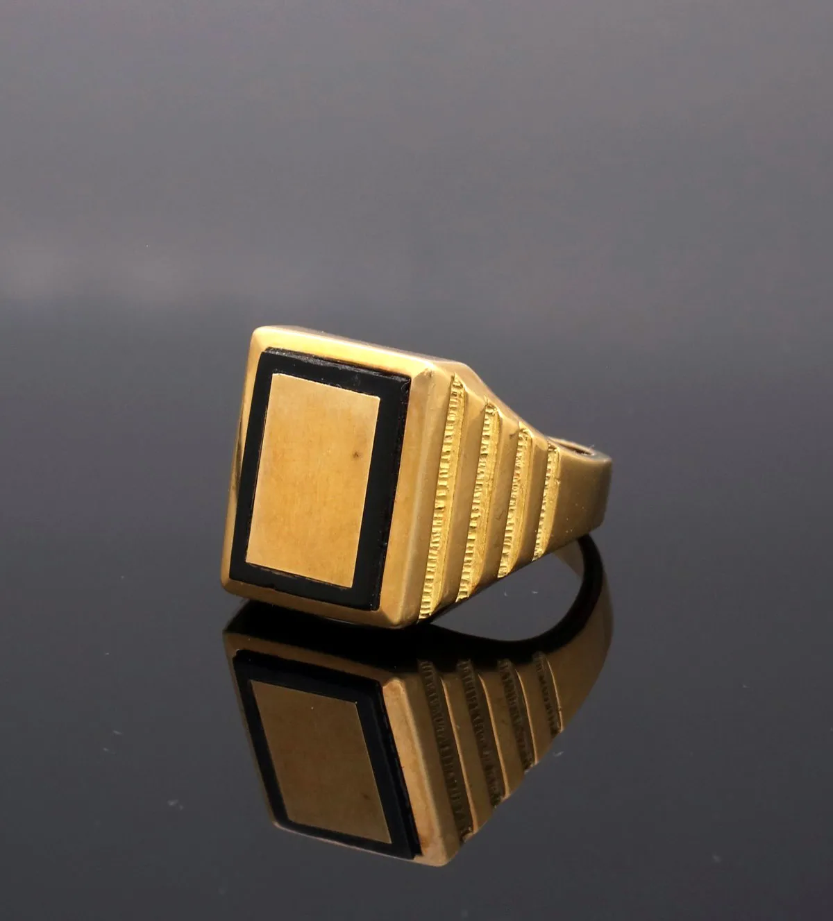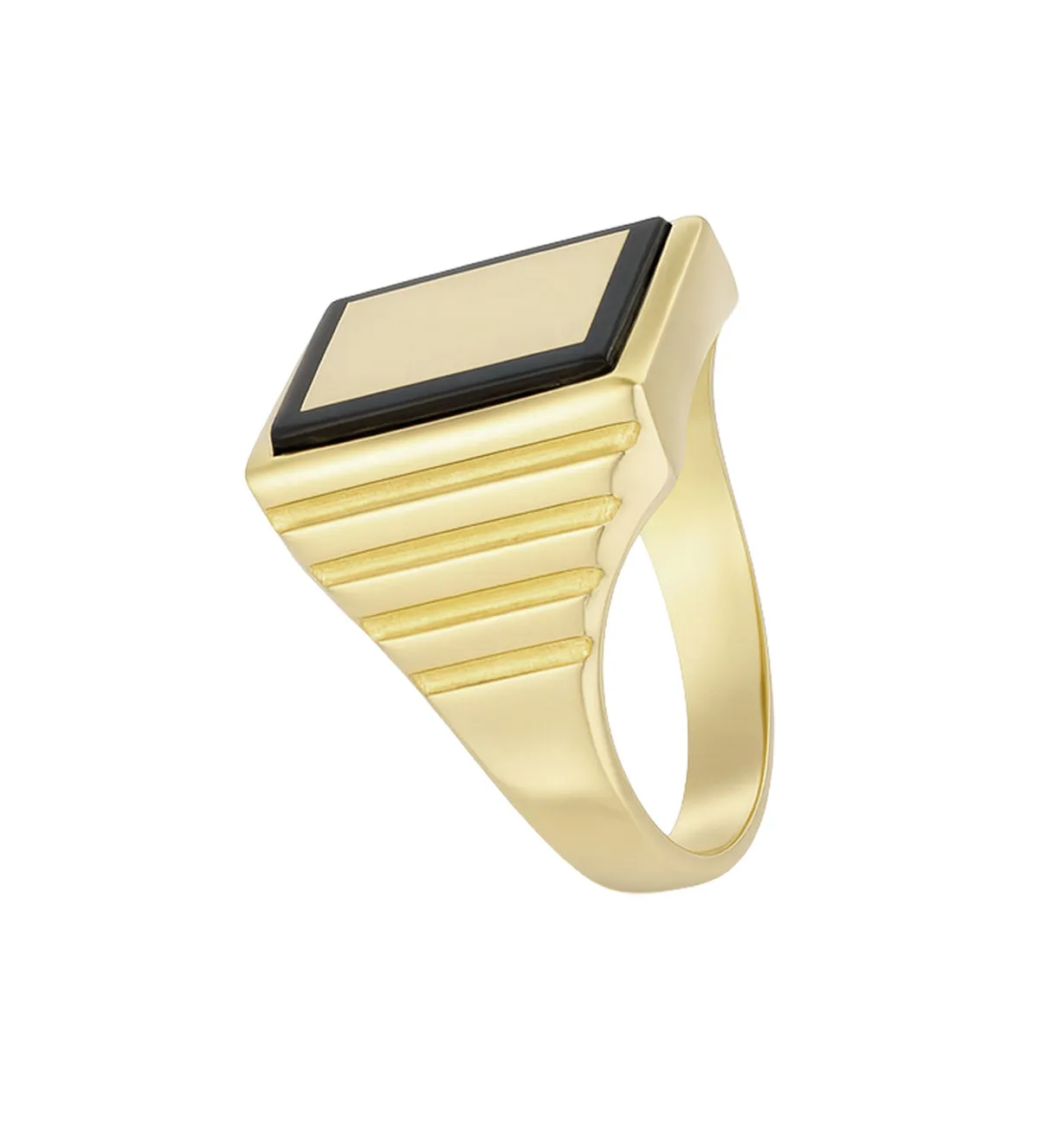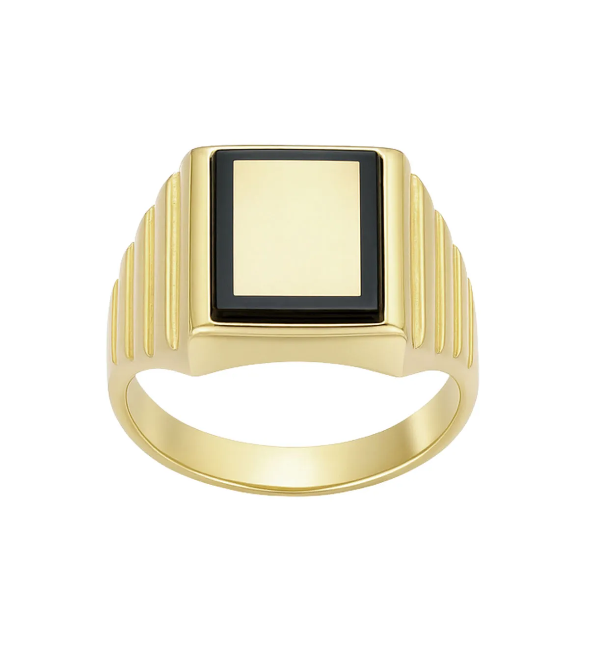 El diseño de este anillo de oro se distingue por su brazo gallonado, que aporta textura y volumen. La cabeza rectangular de 10×14 mm crea una estética geométrica, sólida y masculina. Sobre el ónix se ha colocado una fina chapa de oro perfectamente integrada, pensada para personalizarla mediante grabado de iniciales, lo que convierte esta joya en un objeto profundamente personal y exclusivo.