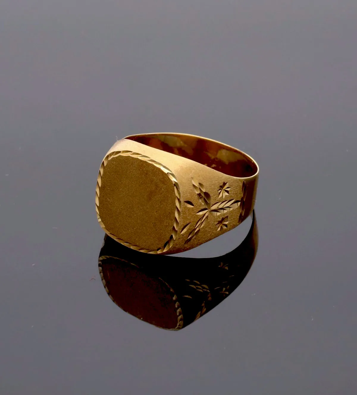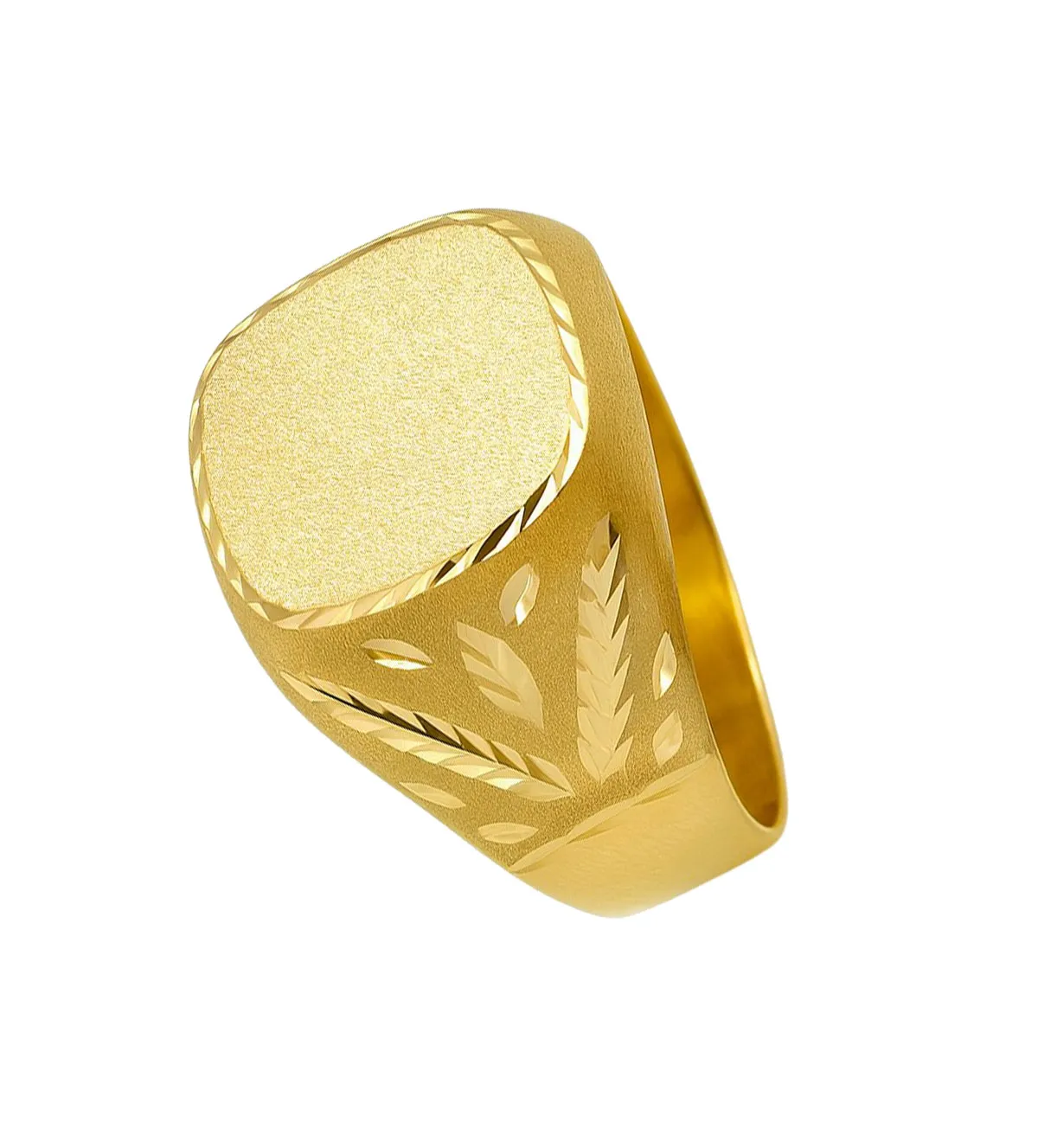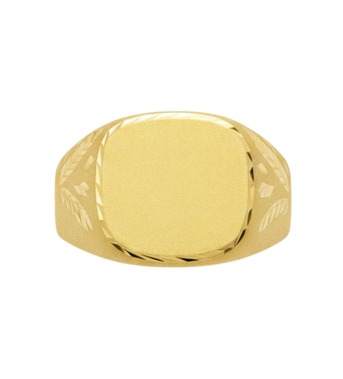 Anillo de oro de hombre 18 k con cabeza cuadrada lisa para grabar y bisel lapidado. Su brazo luce grabados en forma de hojas de laurel sobre fondo mate, símbolo de éxito y distinción. Ideal como regalo de cumpleaños o Día del Padre. Una joya exclusiva de Rubí Joyeros, lista para envío inmediato. ¡Aprovecha antes de que se agote este diseño único en stock!