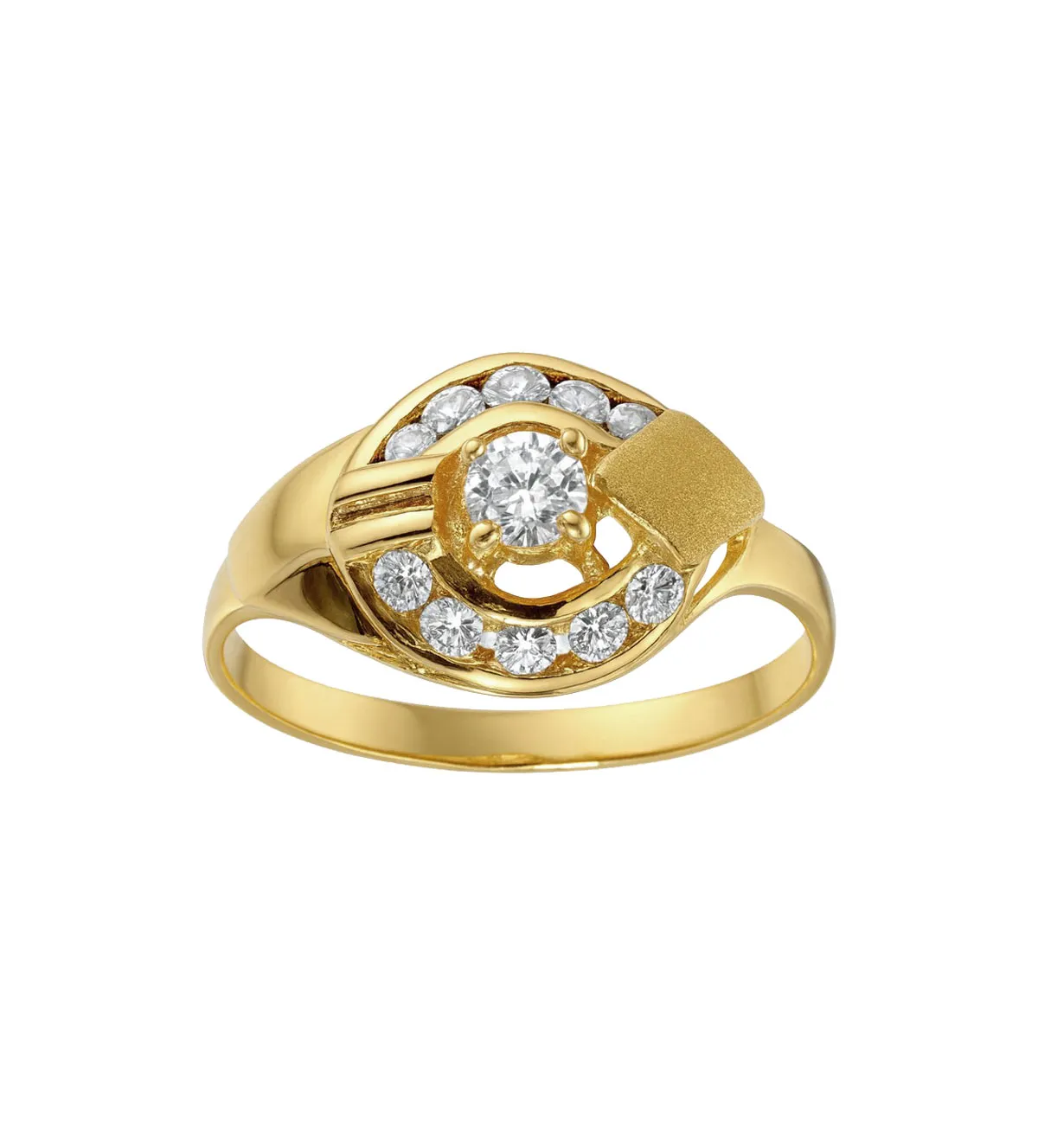 El diseño de este anillo de oro destaca por su gallón circular, que enmarca la circonita central con total armonía. Las circonitas adicionales, dispuestas con precisión, generan un juego de luces que realza los detalles de la sortija.