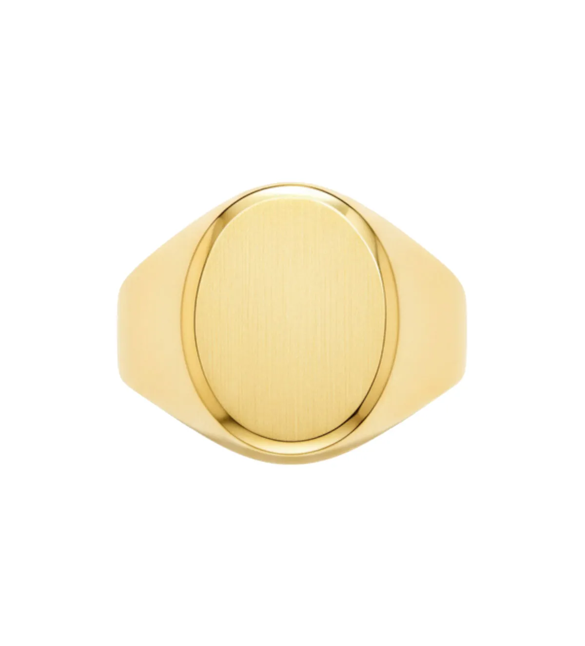 Su diseño clásico, con forma oval y una superficie lisa, permite personalizar el anillo de oro mediante grabado de iniciales, nombres o fechas significativas. El contraste entre el fondo matizado del frontis y el brillo del resto del anillo genera un efecto visual elegante y discreto, ideal para hombres que valoran la sofisticación sin ostentación.