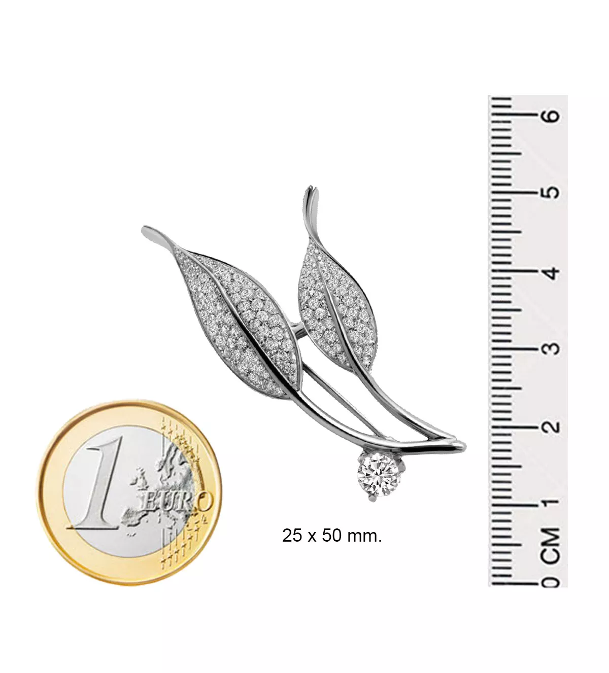 Inspirado en la naturaleza, este broche de plata reproduce una fina rama adornada con dos hojas elípticas, completamente cuajadas de circonitas de alta calidad. En el centro, un brillante fruto se destaca gracias a una circonita de mayor tamaño, engastada en garra para maximizar su luz. Una combinación perfecta de elegancia clásica y modernidad.
