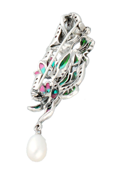 Broche plata para solapa motivo hada, un diseño ideal que siempre llama la atencion, un hada del bosque rodeada de tonos verdes y rojos de esmaltes y piedras que la rodean, una perla cultivada china cuelga del conjunto que se cierra con una púa en cerrojillo de seguridad, utilizalo en solapas de trajes o en cualquiera otra prenda como pañuelos o gorros, según la utilices sera una joya elegante o una joya transgresora.