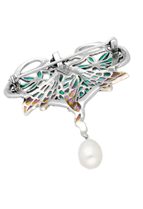Broche plata y esmaltes motivo hada y perla, extraordinario diseño tipo vidriera basado en las hadas del bosque con formas alegóricas cuajadas de esmaltes de colores o marquesitas y con una perla cultivada china colgando como colofón, una joya que jamás pasa desapercibida, lucela en ocasiones especiales y de manera habitual, un toque de distincion que te va a diferenciar de la forma más especial. Este broche dispone de un cierre de púa con seguridad para evitar pinchazos inoportunos y también perdidas.