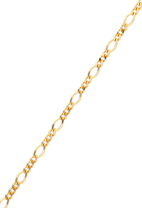 El diseño 3×1 de esta cadena de oro combina tres eslabones pequeños con uno ovalado de mayor tamaño, creando un equilibrio perfecto entre clasicismo y modernidad. Esta estructura le otorga un aspecto refinado, ideal para complementar cualquier atuendo. Además, su acabado pulido refleja la luz de manera excepcional, resaltando su belleza natural.